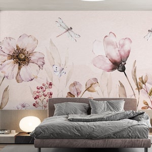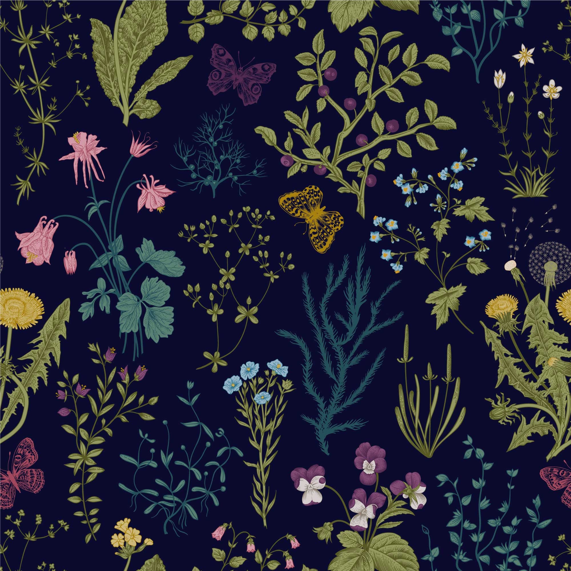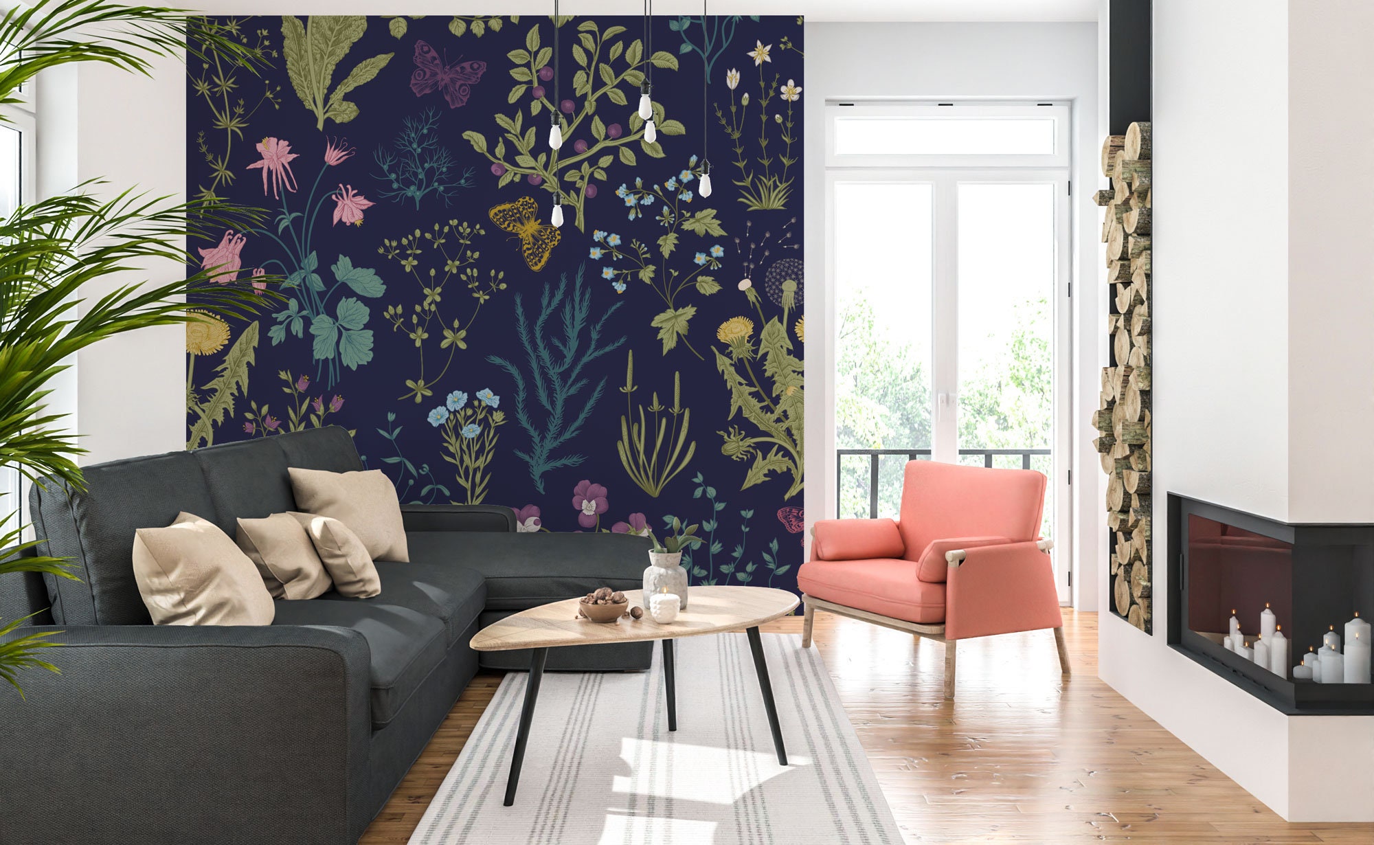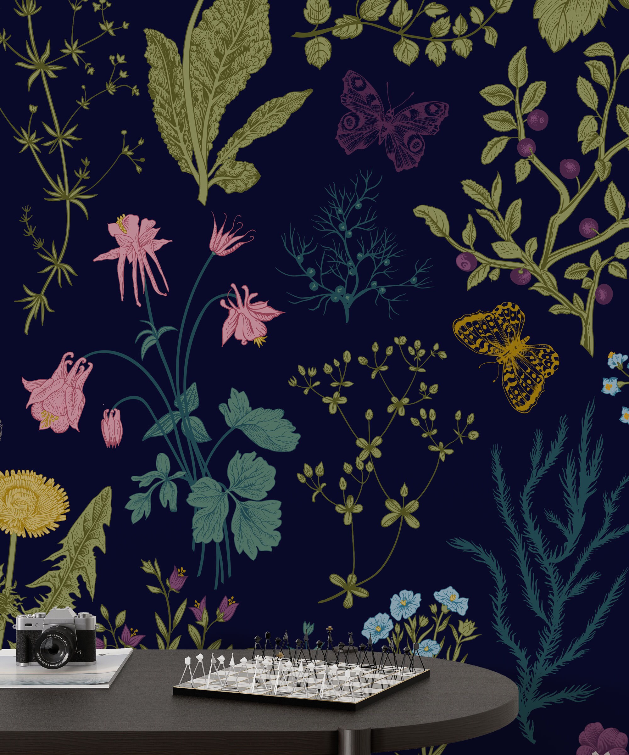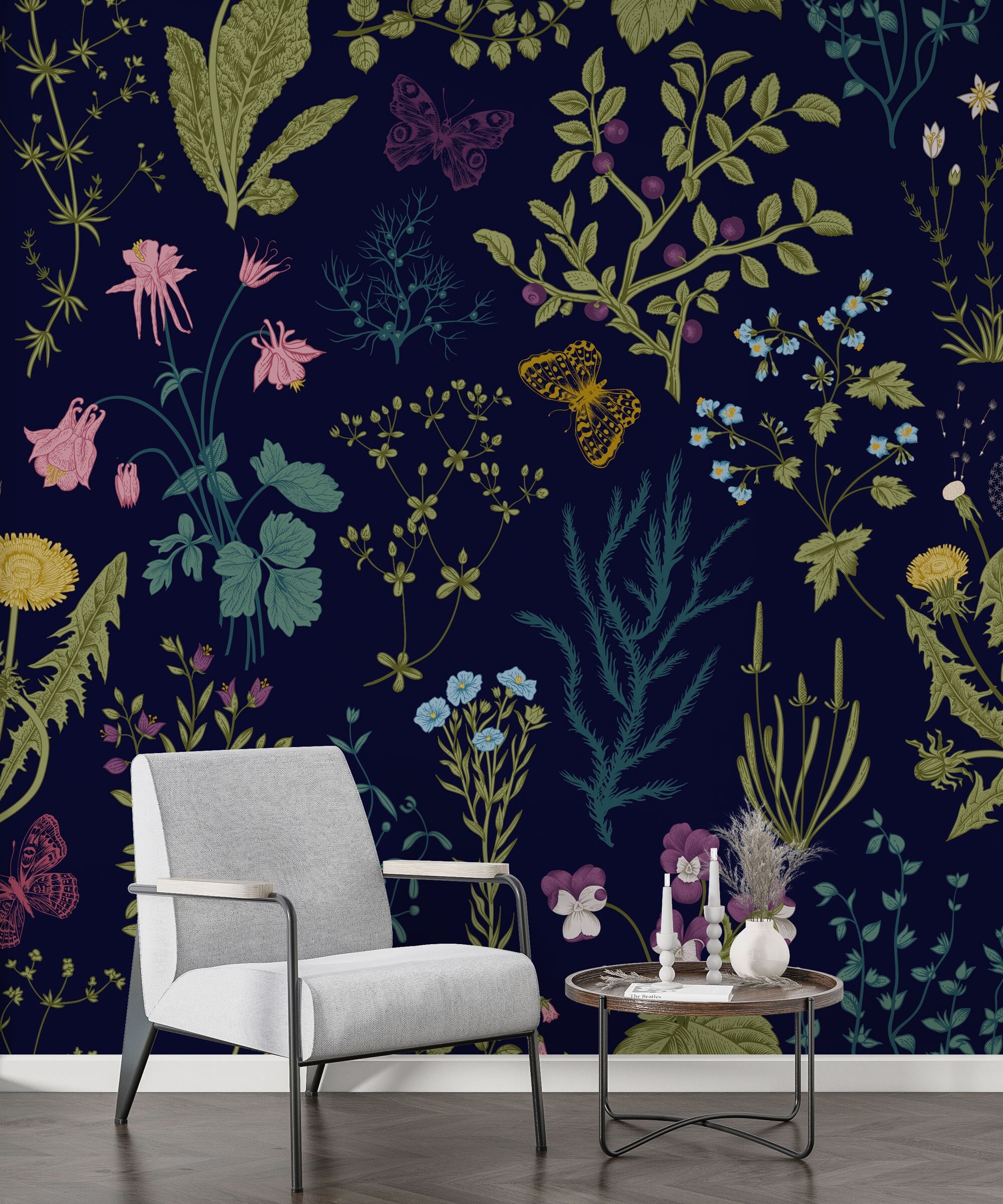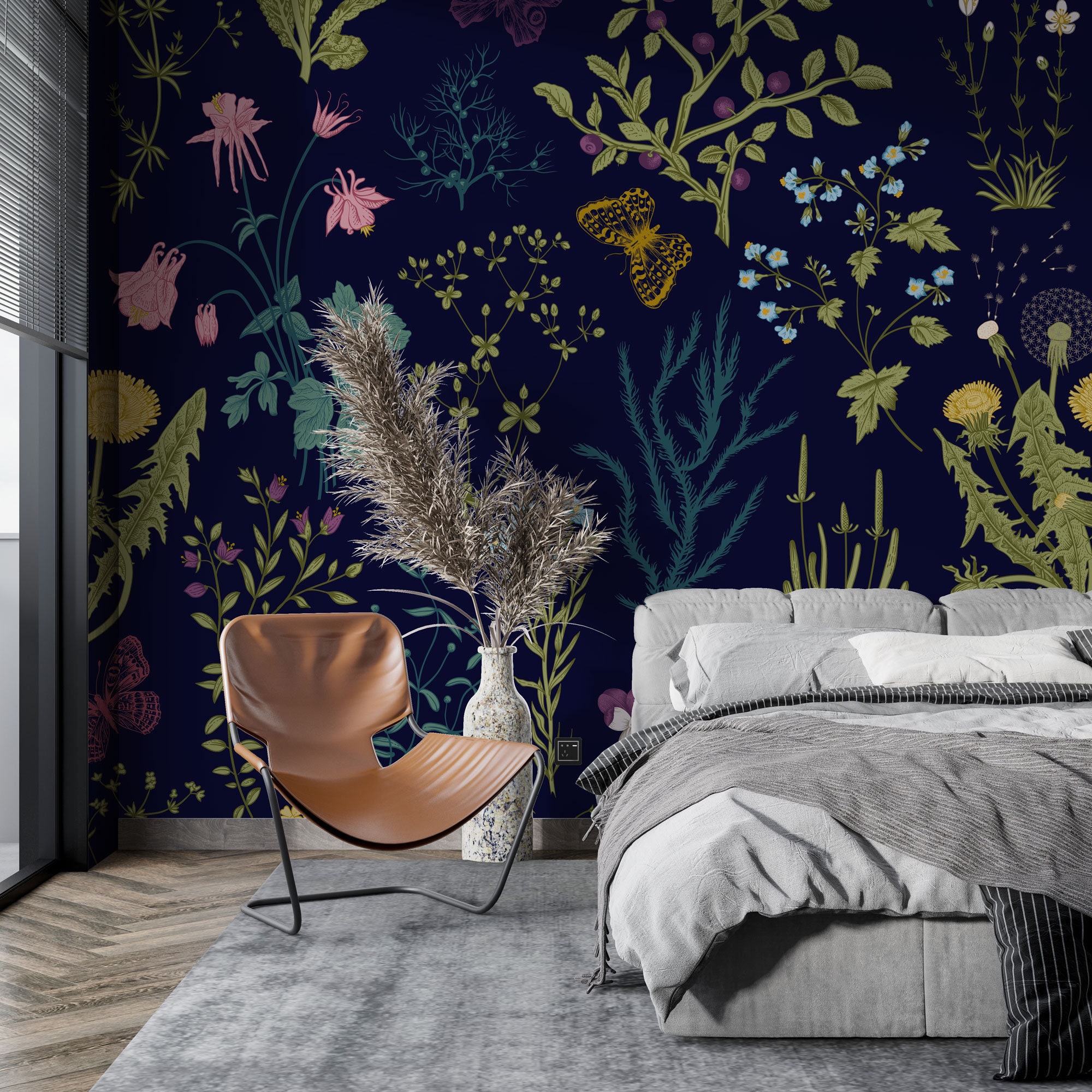 Navy Blue Background Floral Wallpaper , Peel and Stick Colorful Flowers Dark Background Mural , Vintage Floral Wall Poster