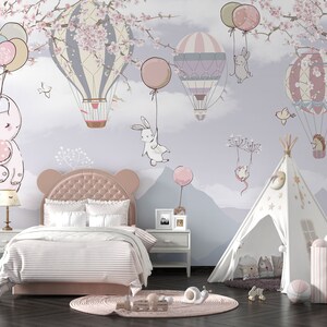 Flying Baloons Carrying Animals Mural - Sweet Animals Wallpaper- Removable - Peel and Stick- Customizable - Nursery Decor -Babyshower Gift