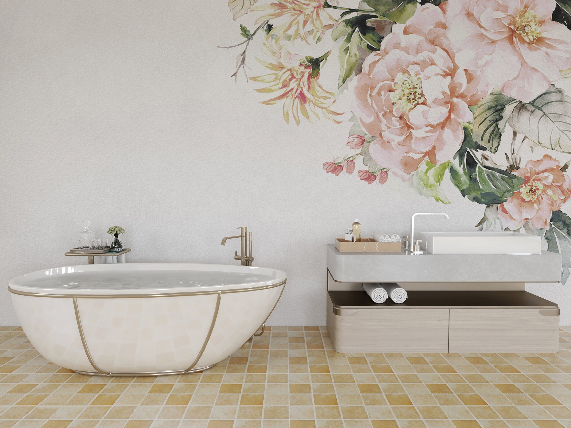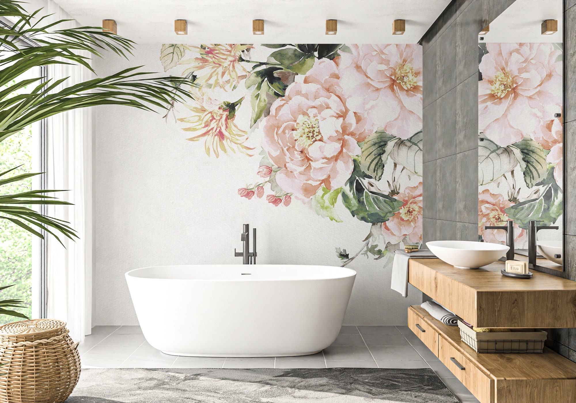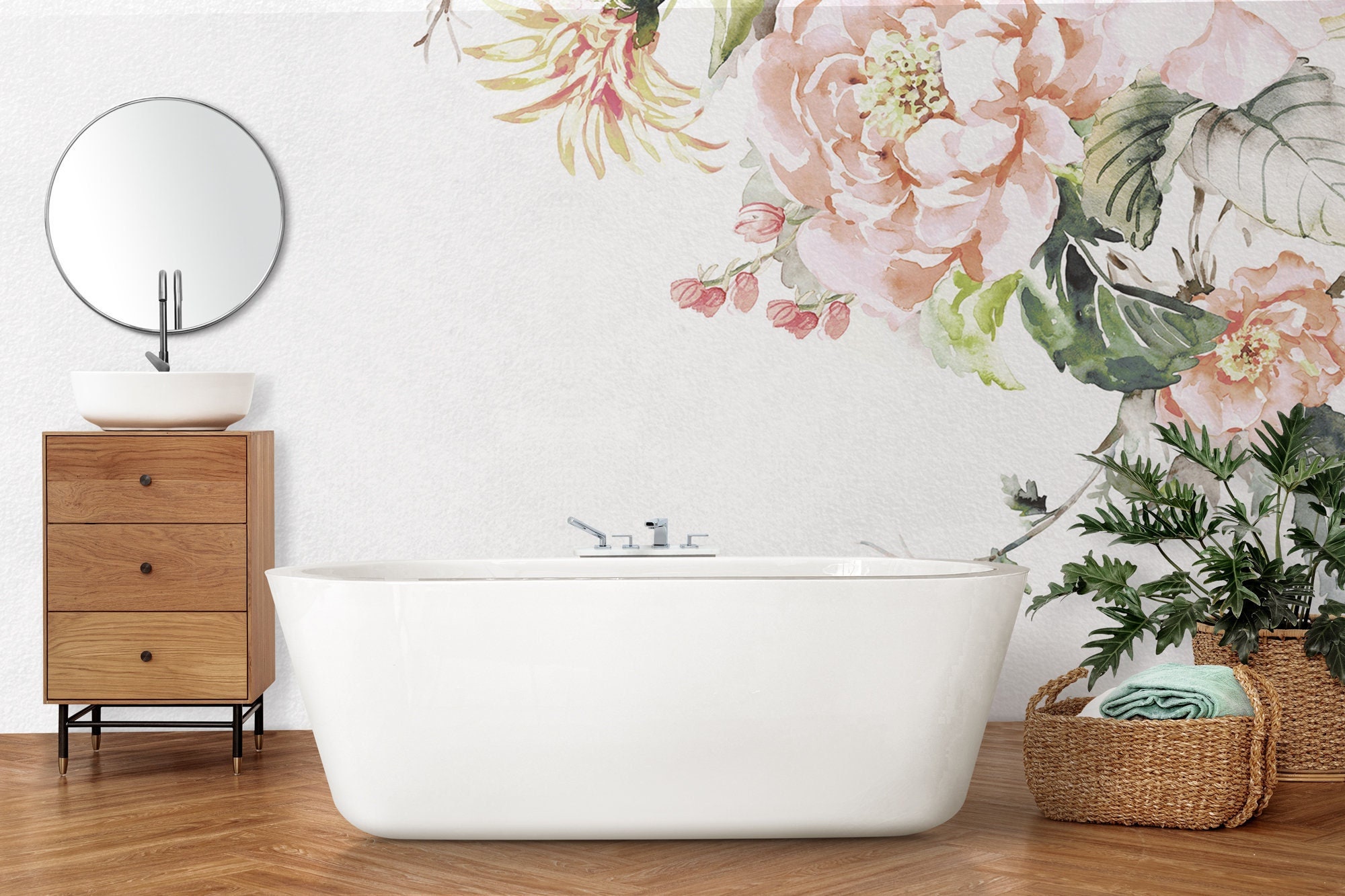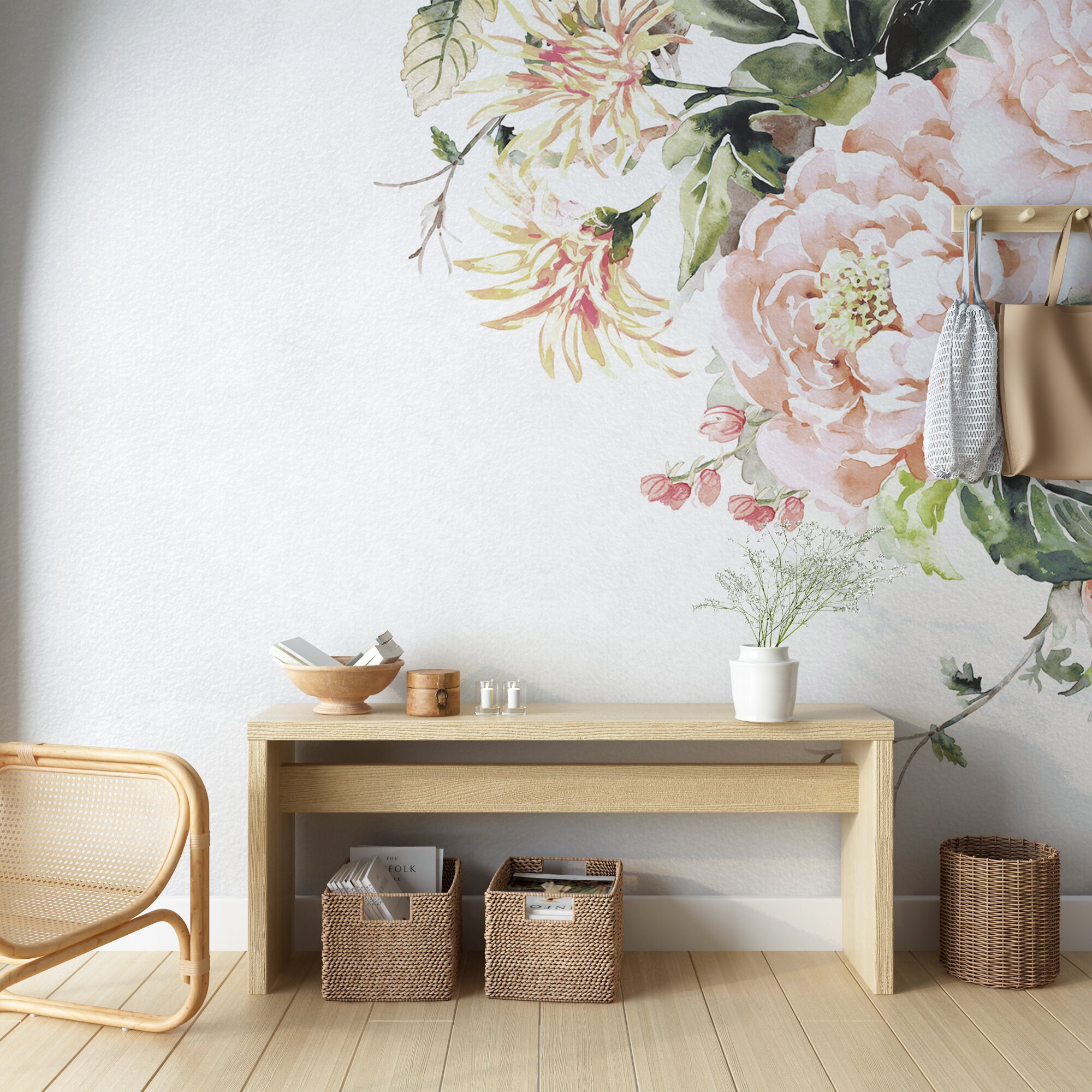 Watercolor Flowers Boho Vintage Wallpaper - Peel and Stick Floral Mural , Big Flowers White Wallpaper , Vintage Floral Mural, Flower Bucket