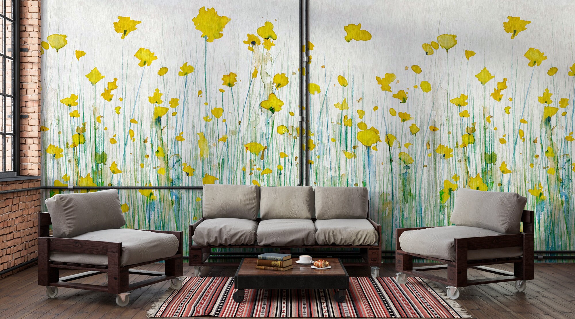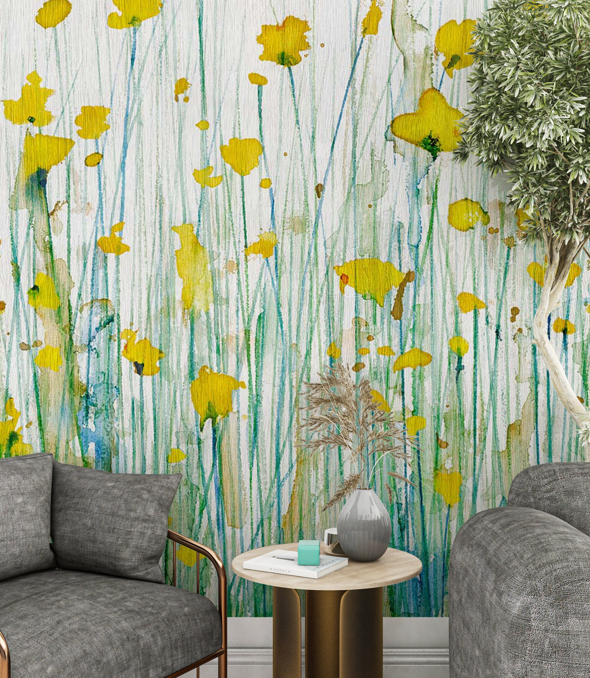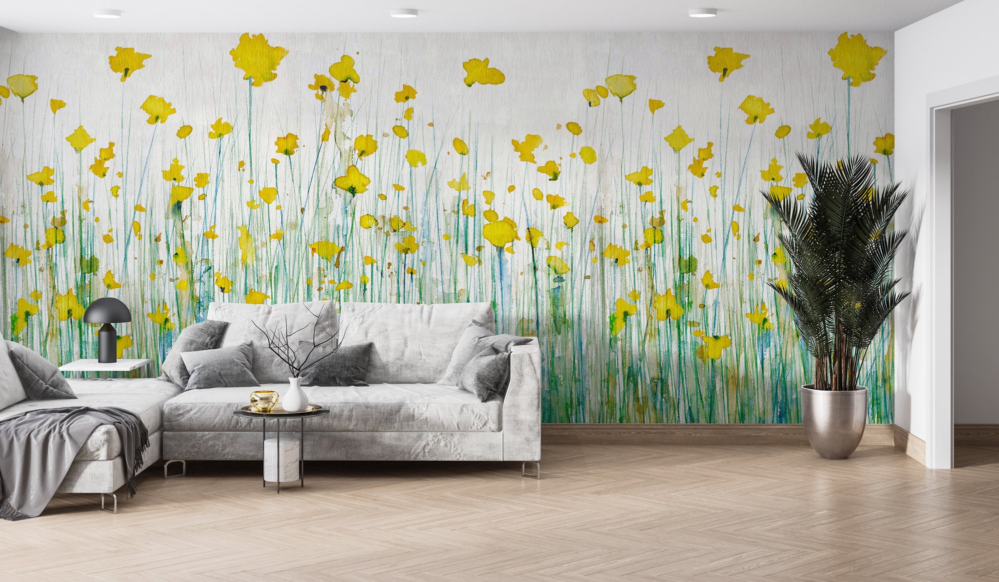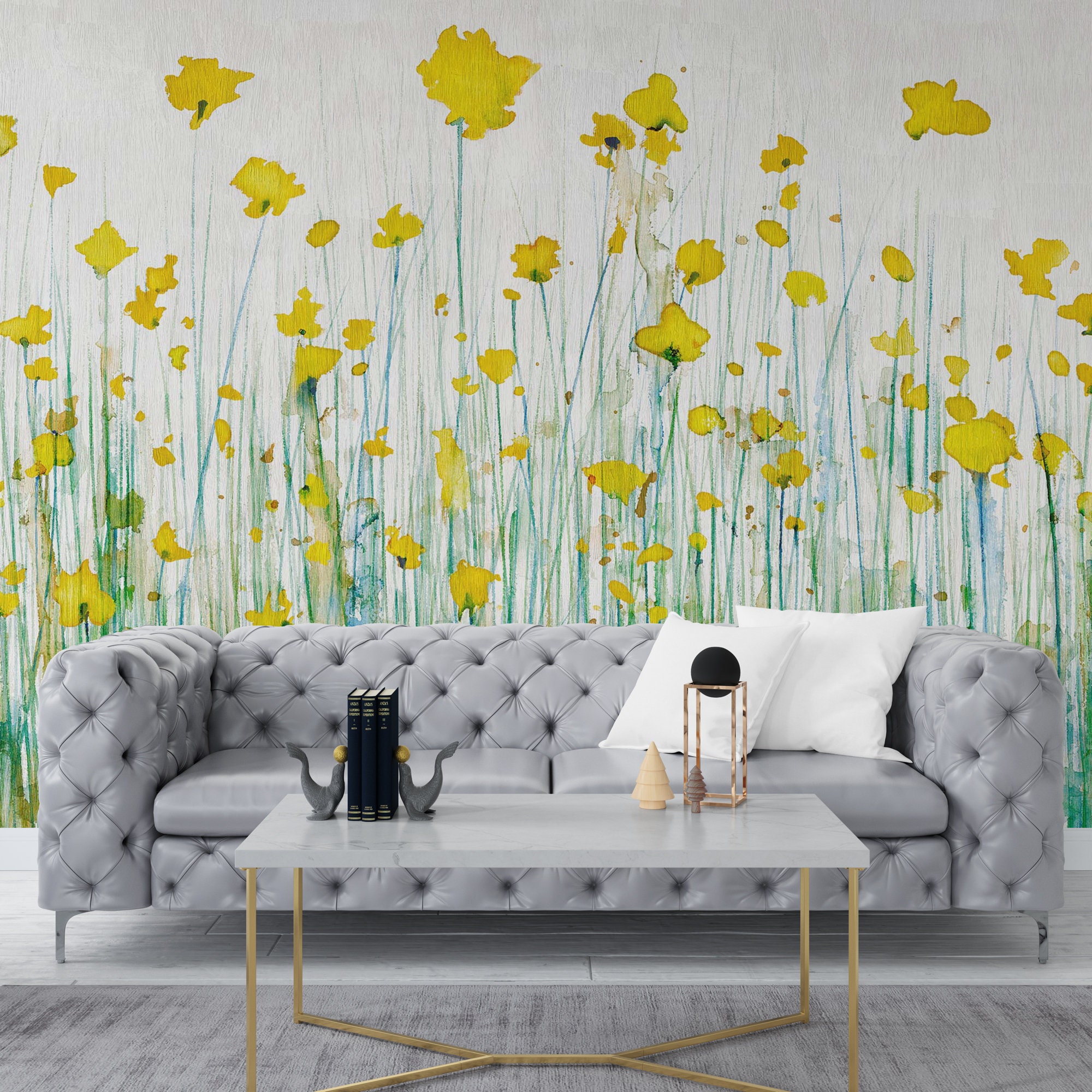 Watercolor Flowers Peel and Stick Wallpaper , Removable Floral Mural , Sunny Summer Wall Mural , Botanical Wallpaper