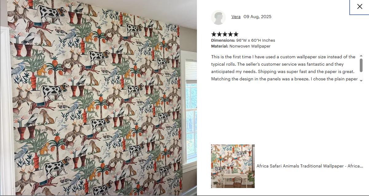 This is the first time I have used a custom wallpaper size instead of the typical rolls. The seller’s customer service was fantastic and they anticipated my needs. Shipping was super fast and the paper is great. Matching the design in the panels was a breeze. I chose the plain paper used with glue applied to the wall and it was fast and easy to install. Fabulous buying experience.