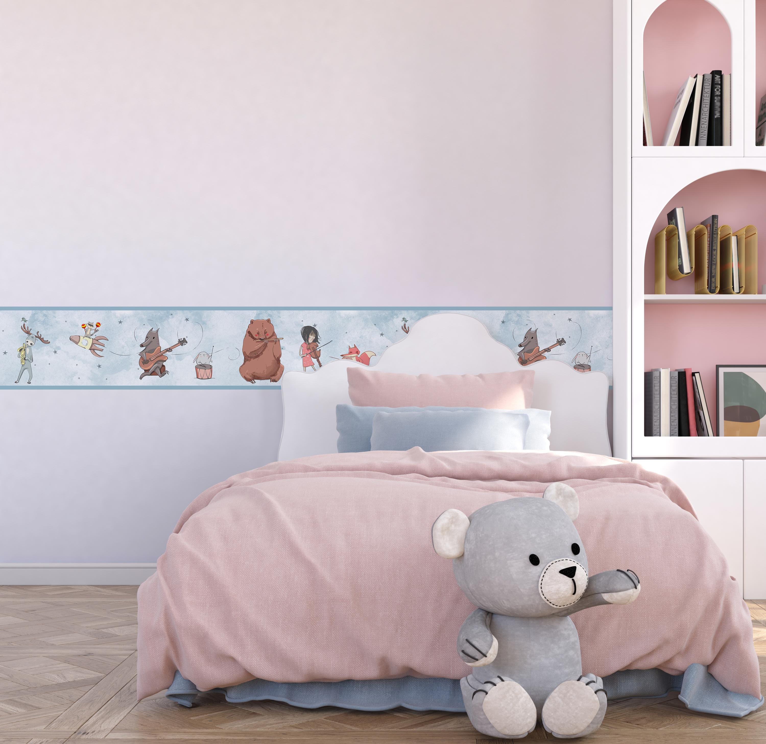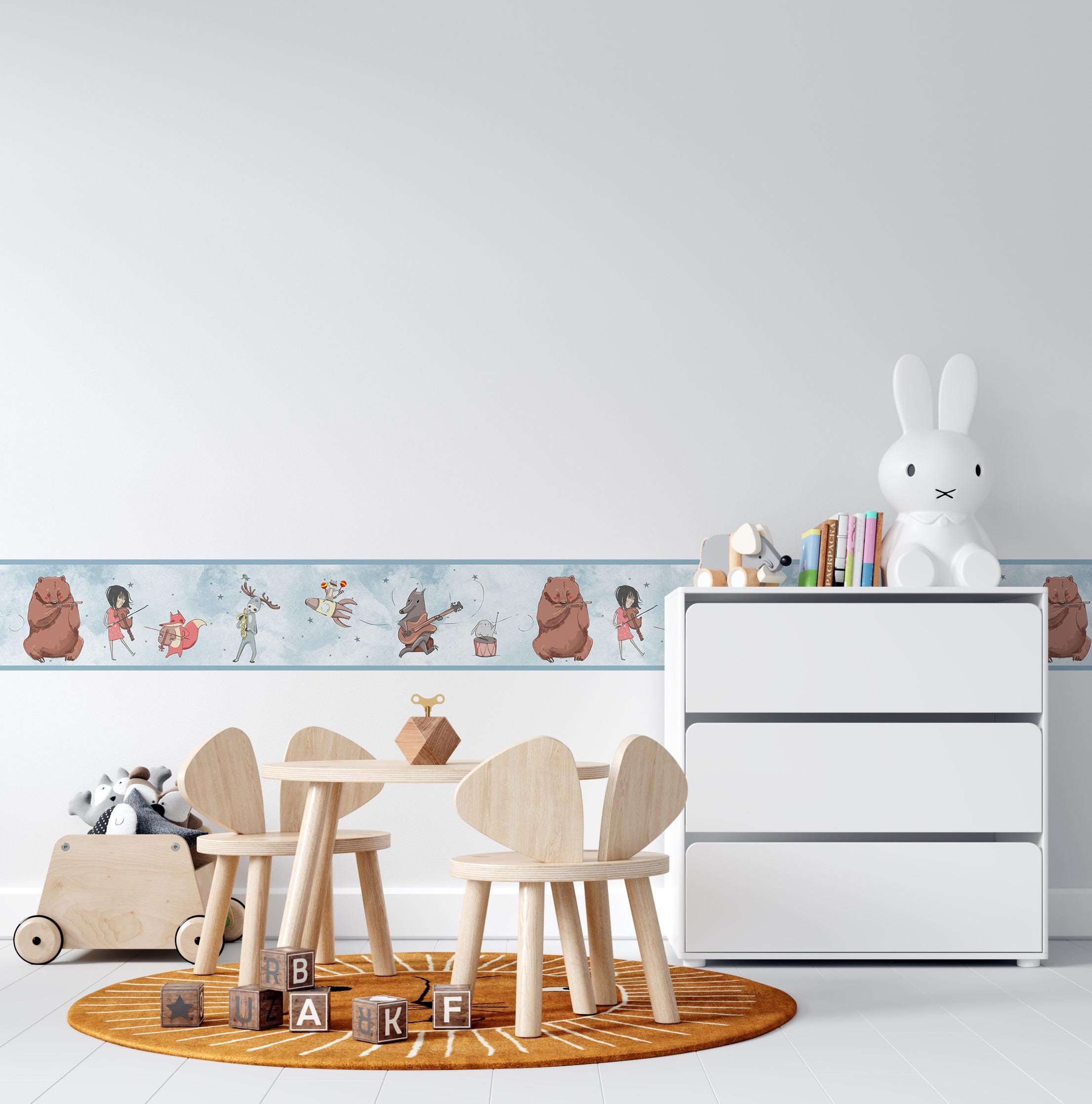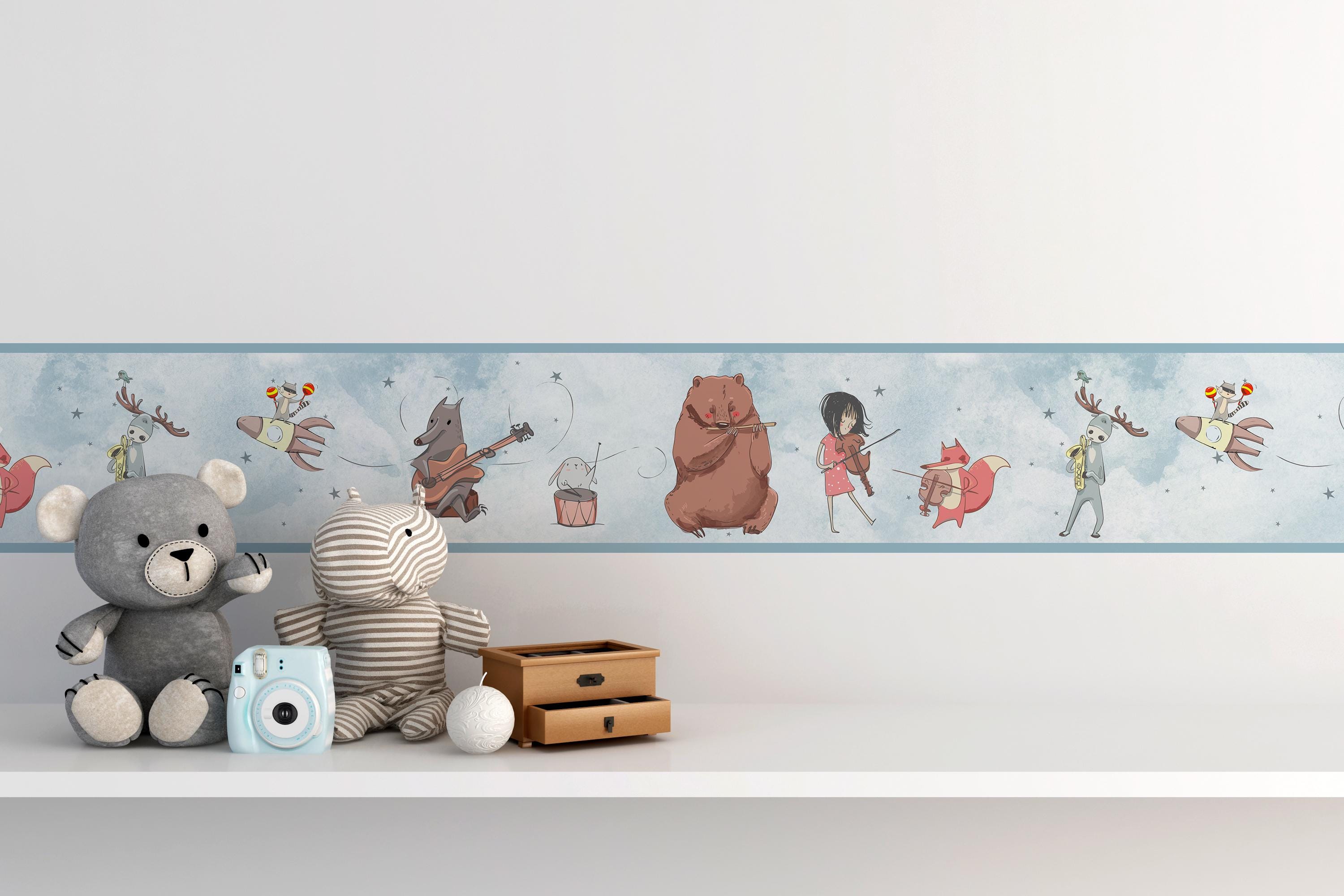 Blue Baby Boy Wall Border โ€“ Rocket & Animal Musician Wallpaper Strip โ€“ Peel and Stick Nursery Decor โ€“ Music Themed Removable Border
