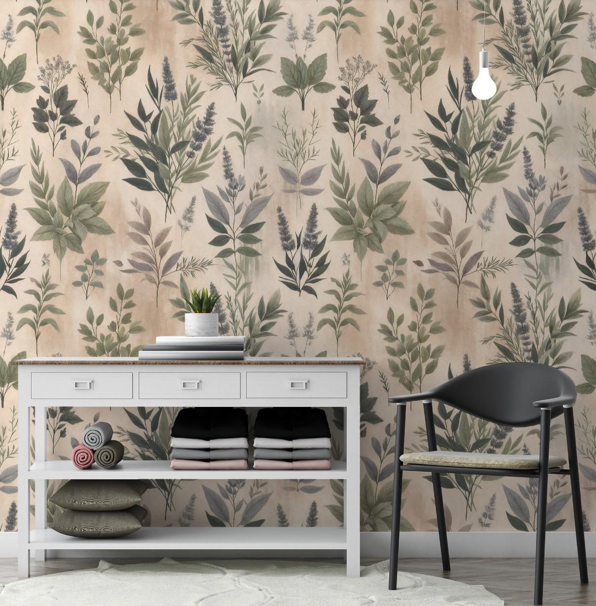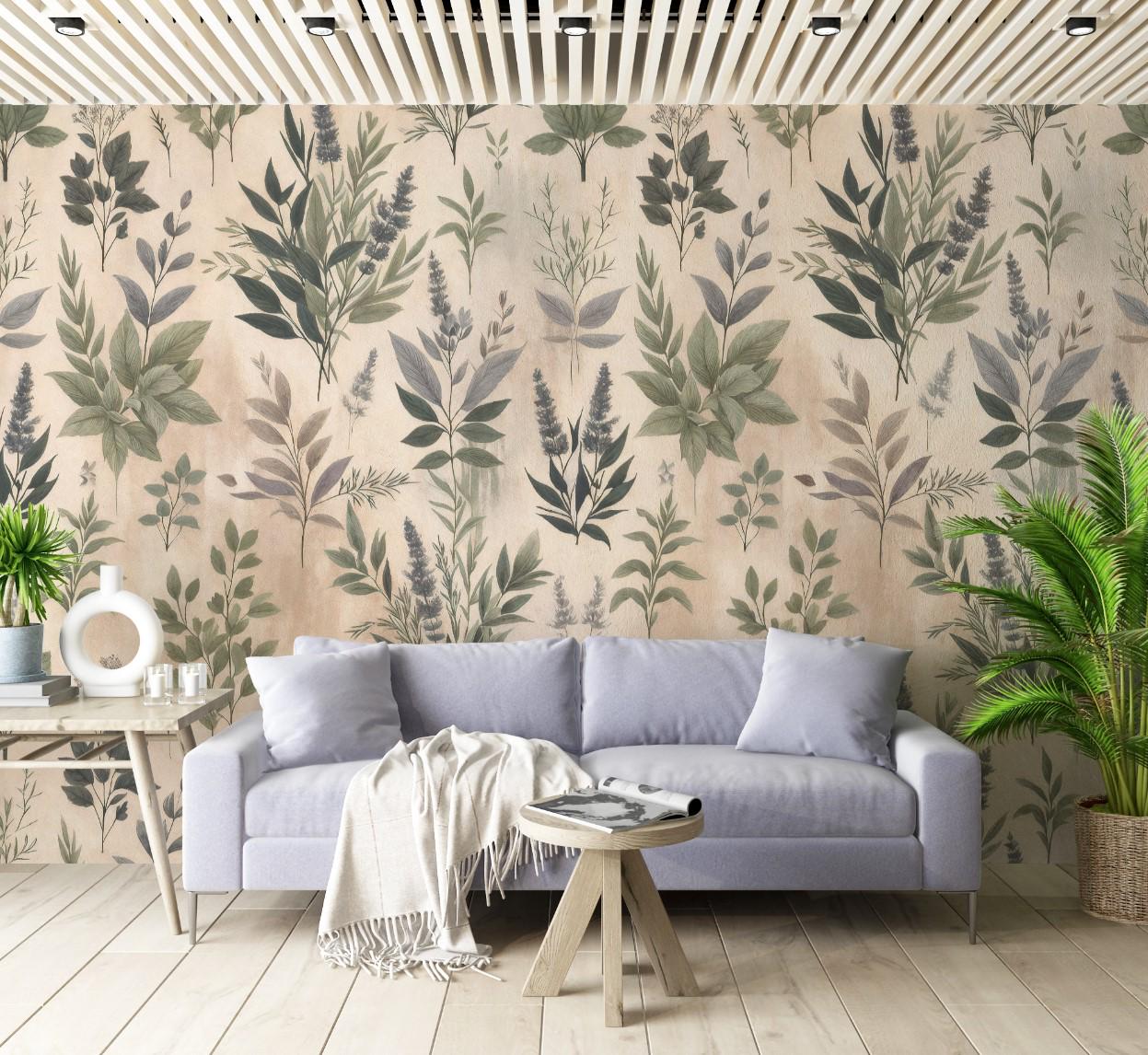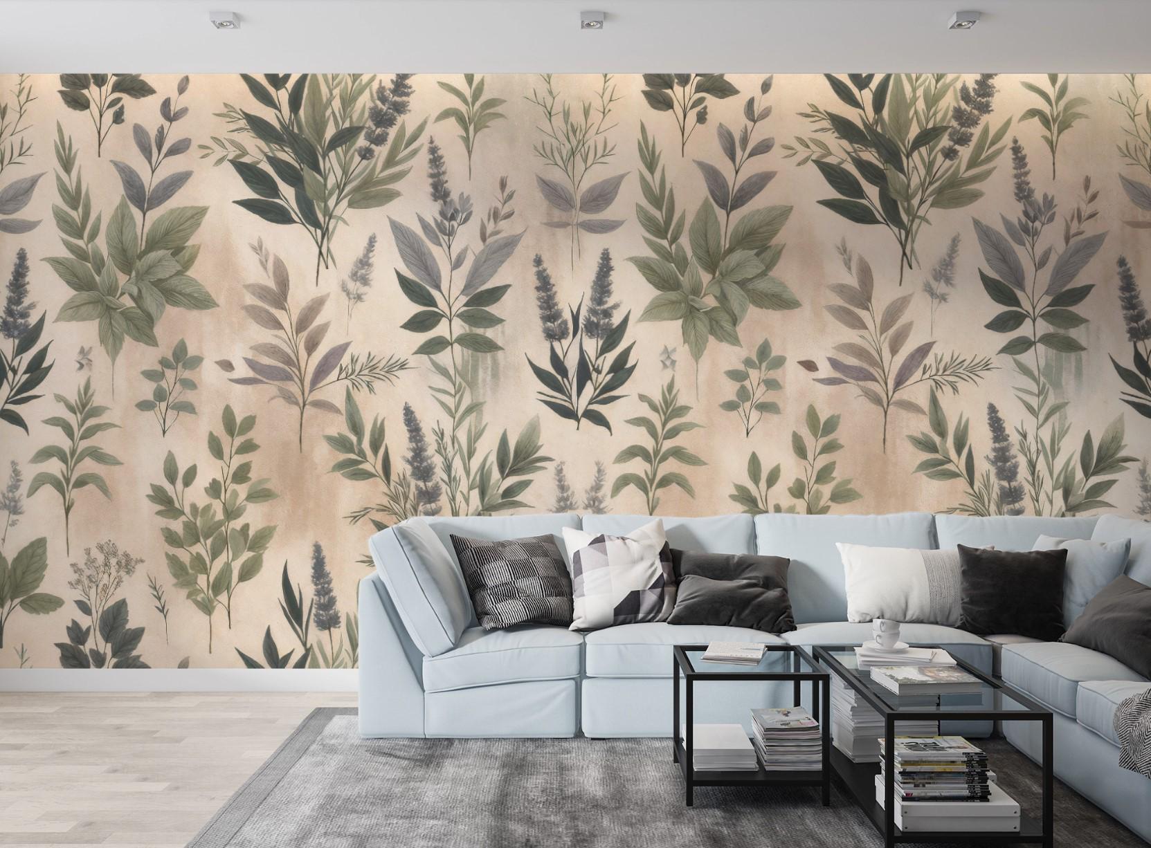 Bring timeless elegance to your home with this vintage botanical wall mural featuring lush green leaves and delicate plant illustrations on a soft beige background. Perfect for creating a warm, nature-inspired atmosphere in your living room, bedroom, or office.