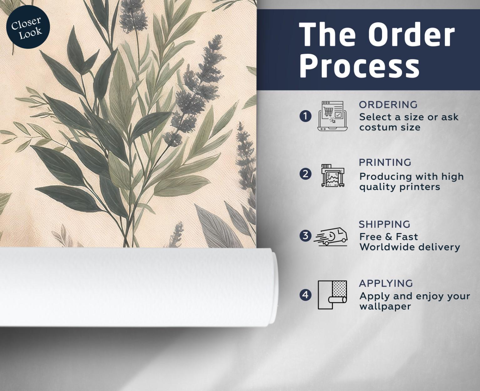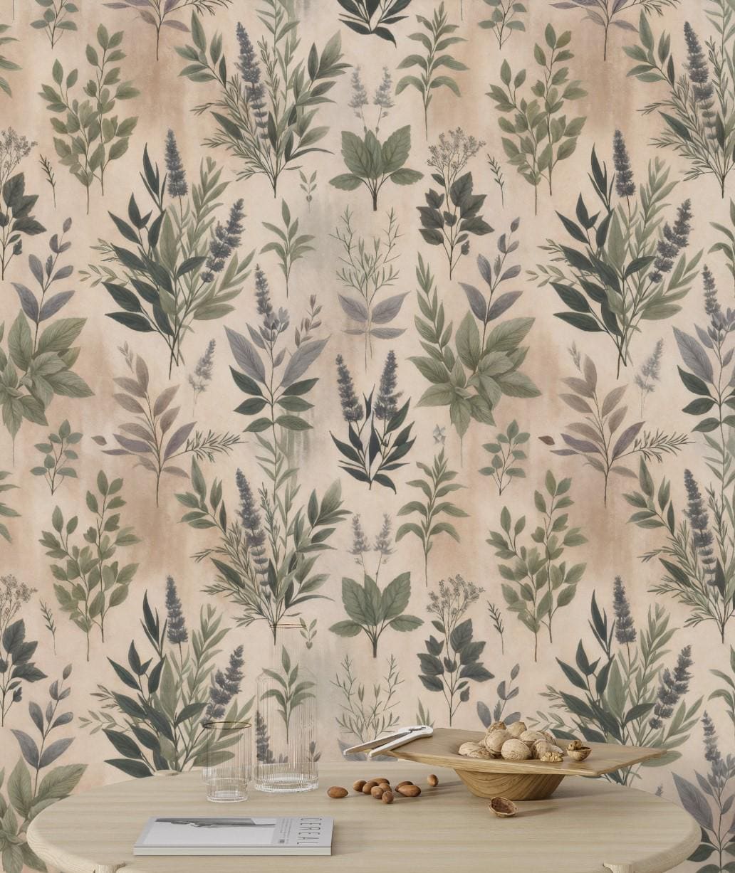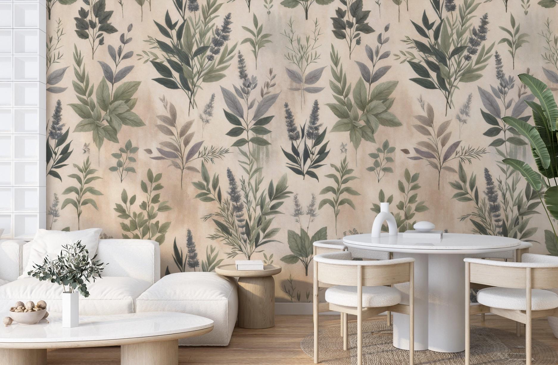 Bring timeless elegance to your home with this vintage botanical wall mural featuring lush green leaves and delicate plant illustrations on a soft beige background. Perfect for creating a warm, nature-inspired atmosphere in your living room, bedroom, or office.