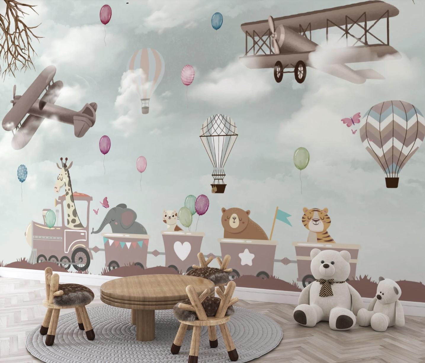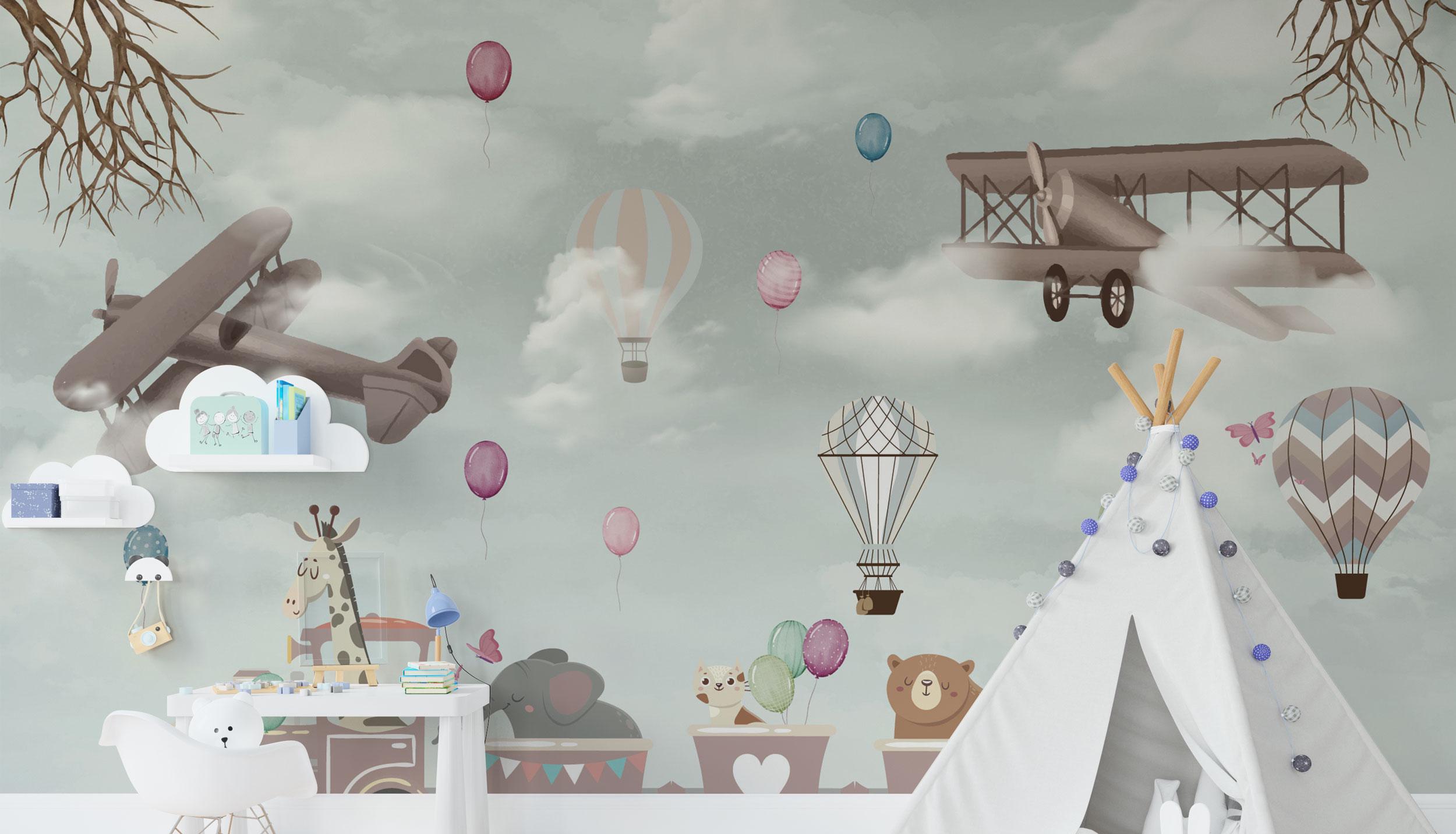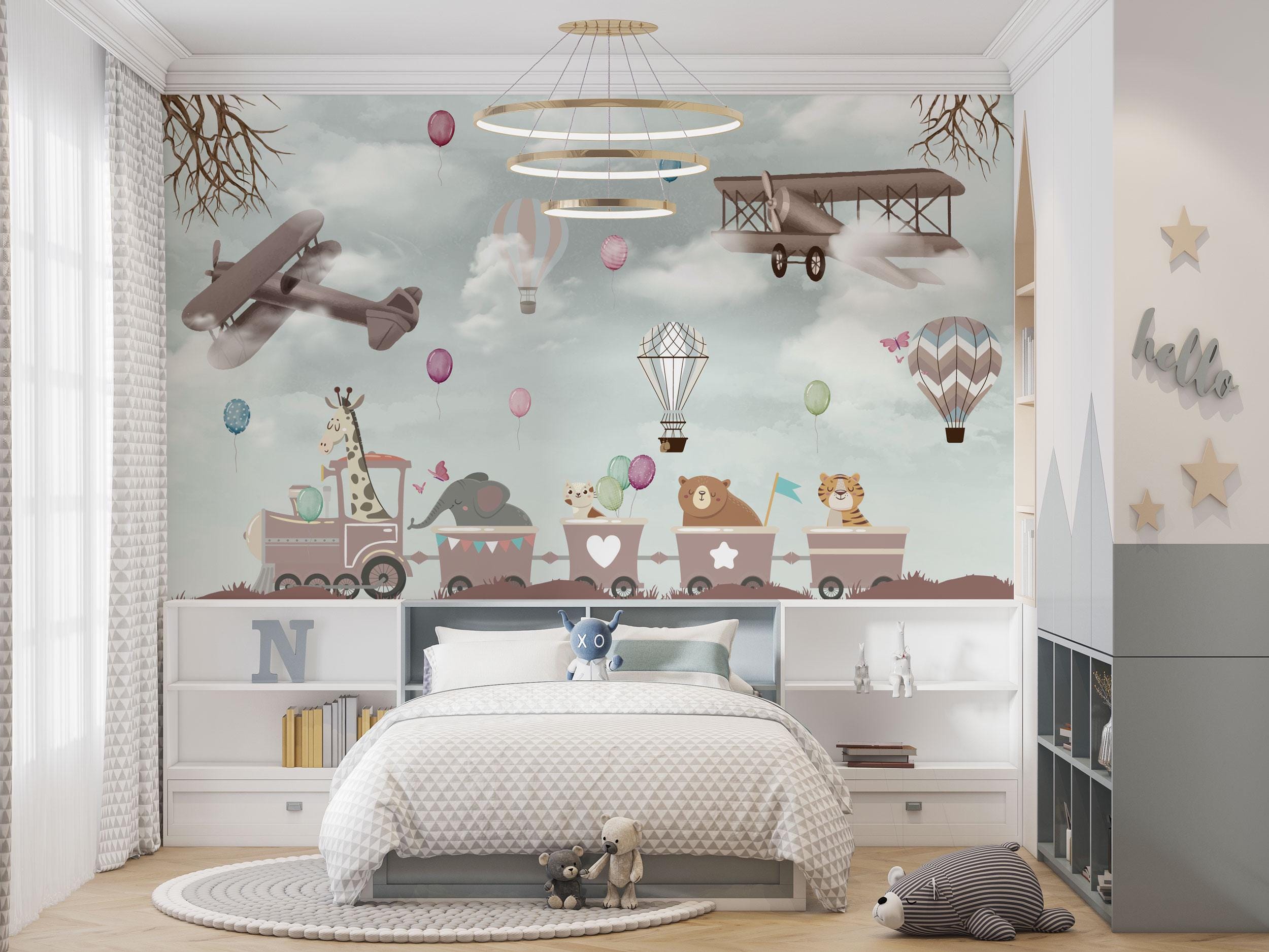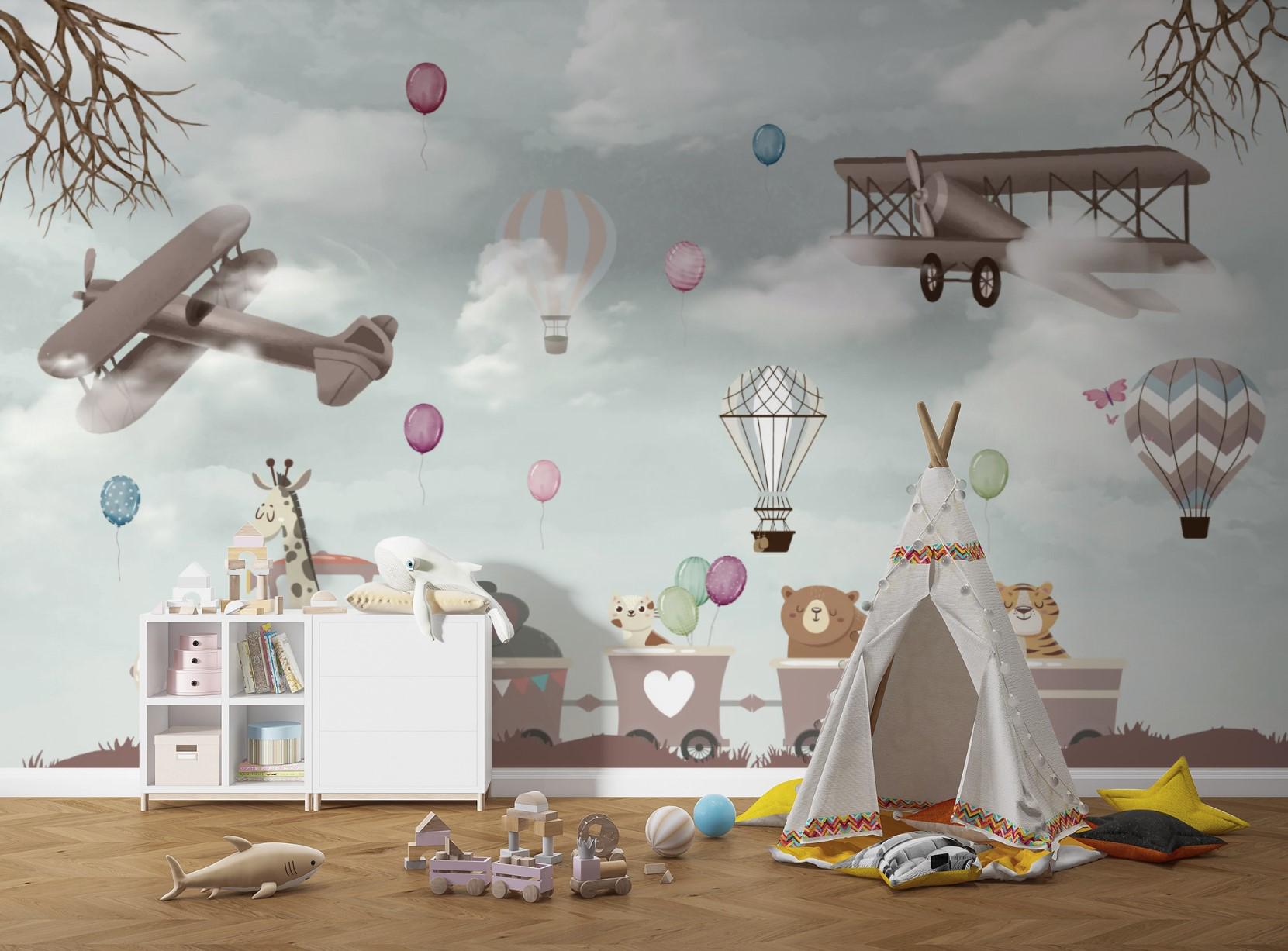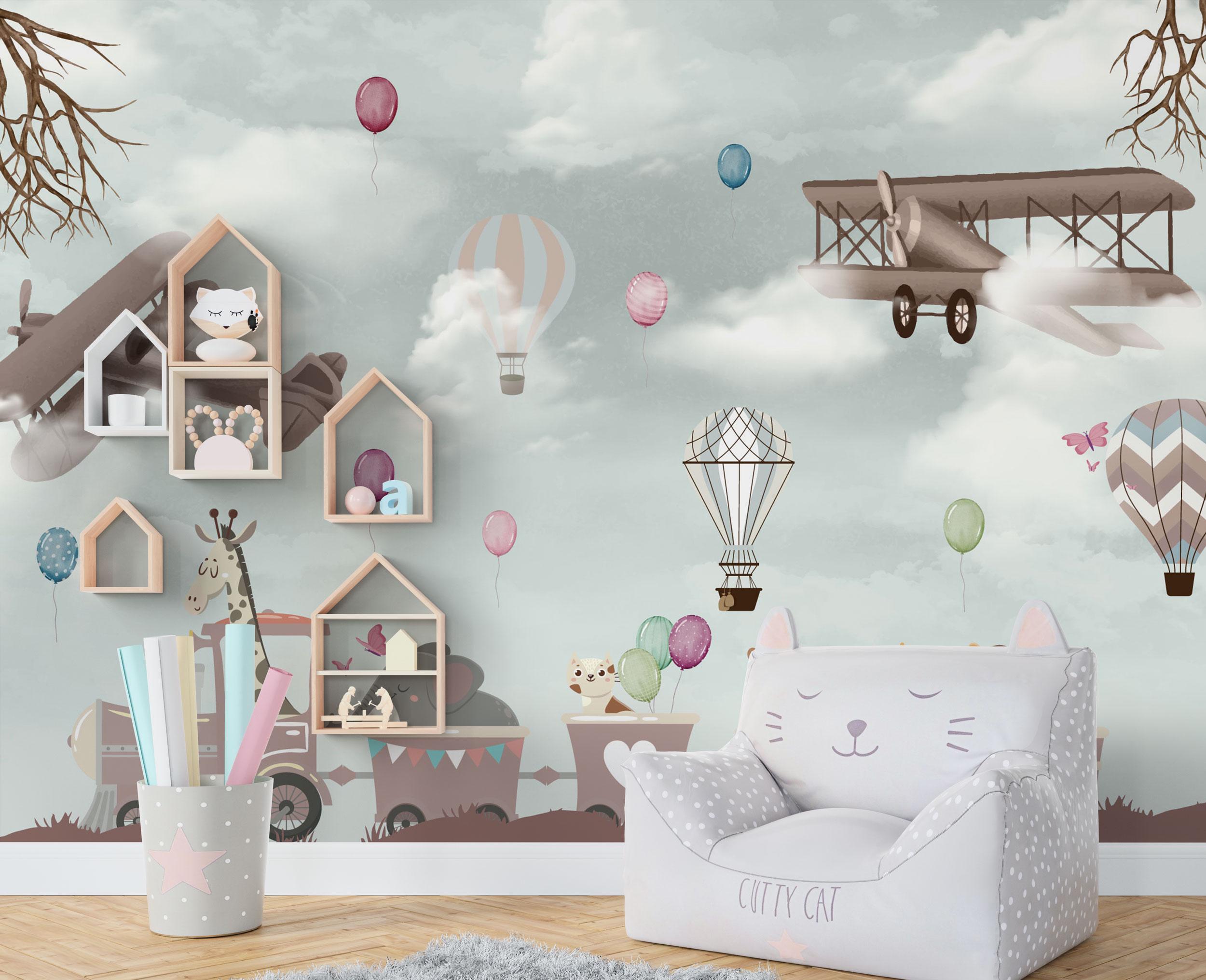 Transform your little one’s space into a dreamy adventure with this whimsical hot air balloon and airplane nursery wall mural. Featuring playful animals, colorful balloons, and vintage planes floating through soft clouds, it’s the perfect backdrop for a creative and cozy atmosphere.