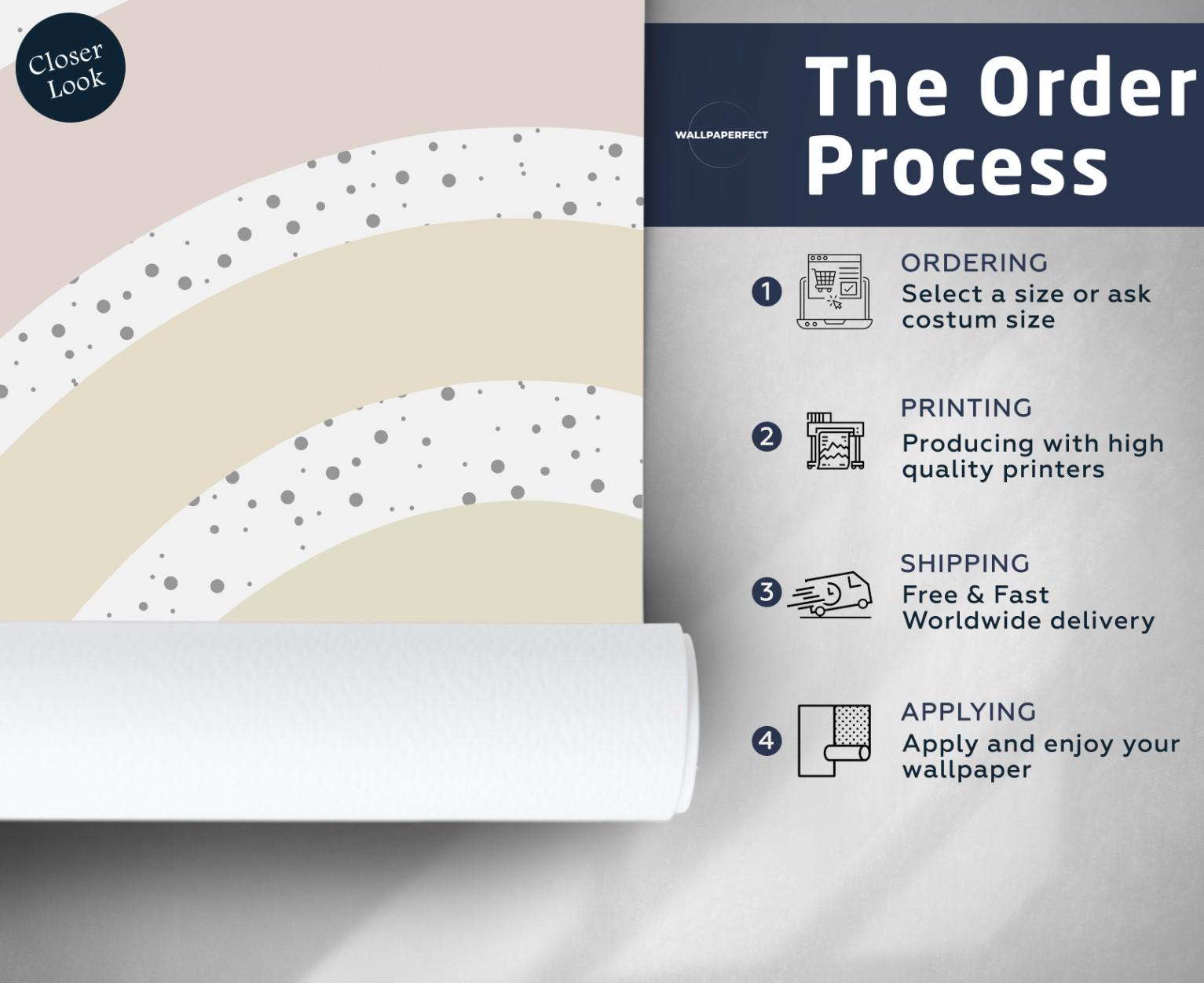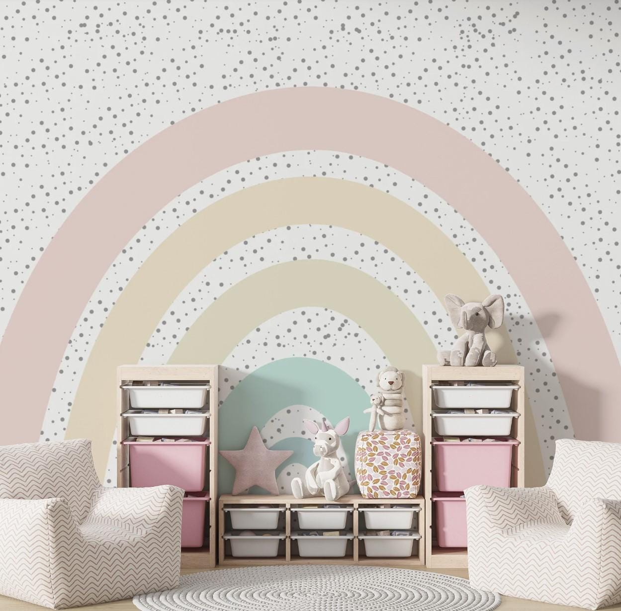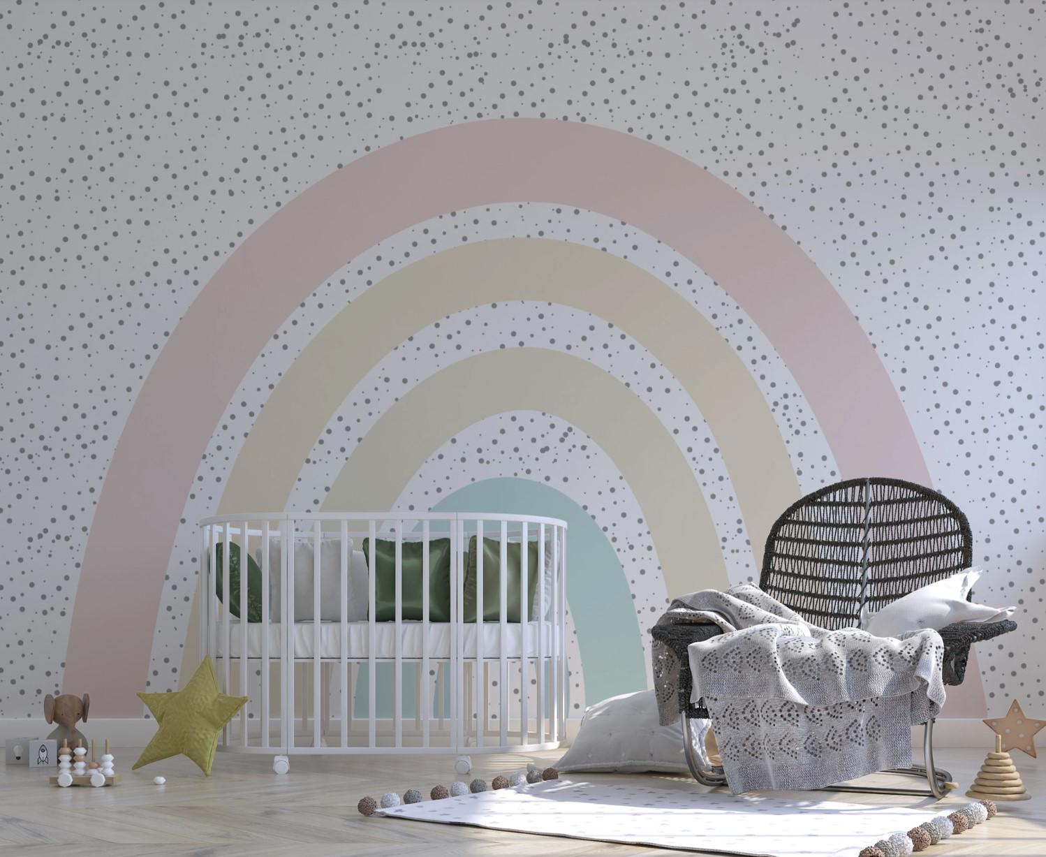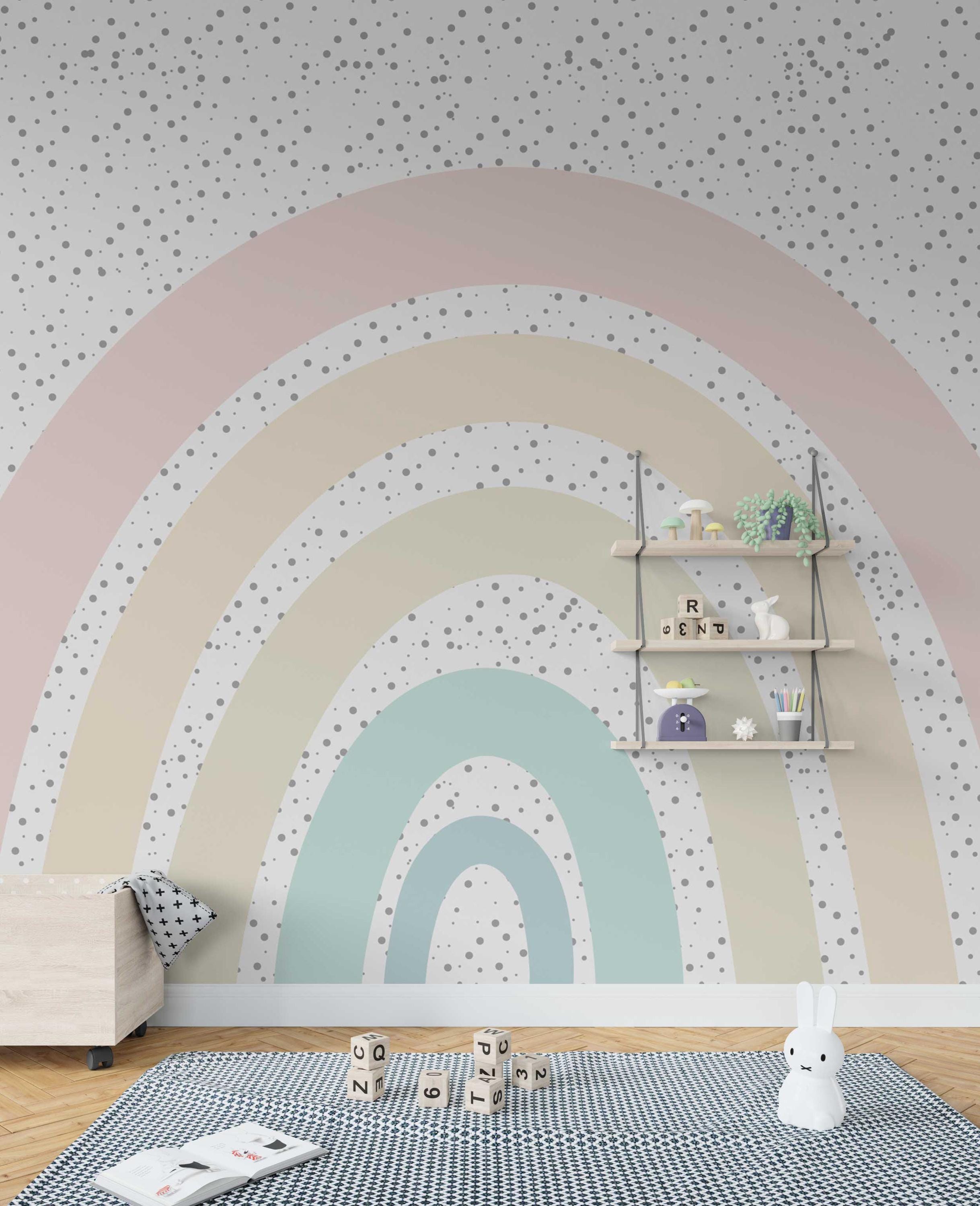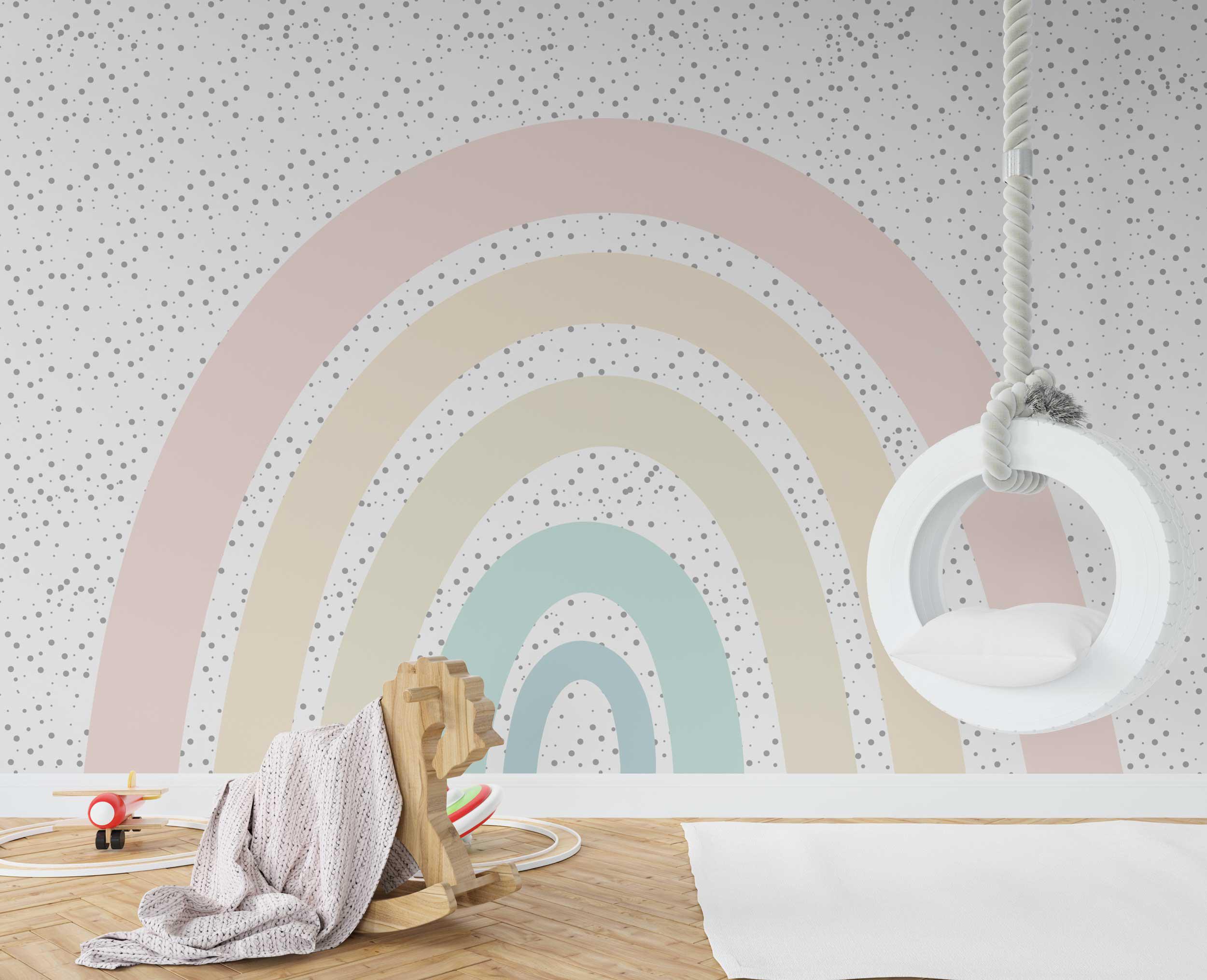 Transform your child’s room with this pastel rainbow wall mural featuring soft muted colors and playful polka dots. Perfect for a Scandinavian-inspired nursery, gender neutral baby room, or modern kids’ space. This minimalist rainbow wallpaper creates a calming yet cheerful atmosphere while adding a stylish focal point to the walls.