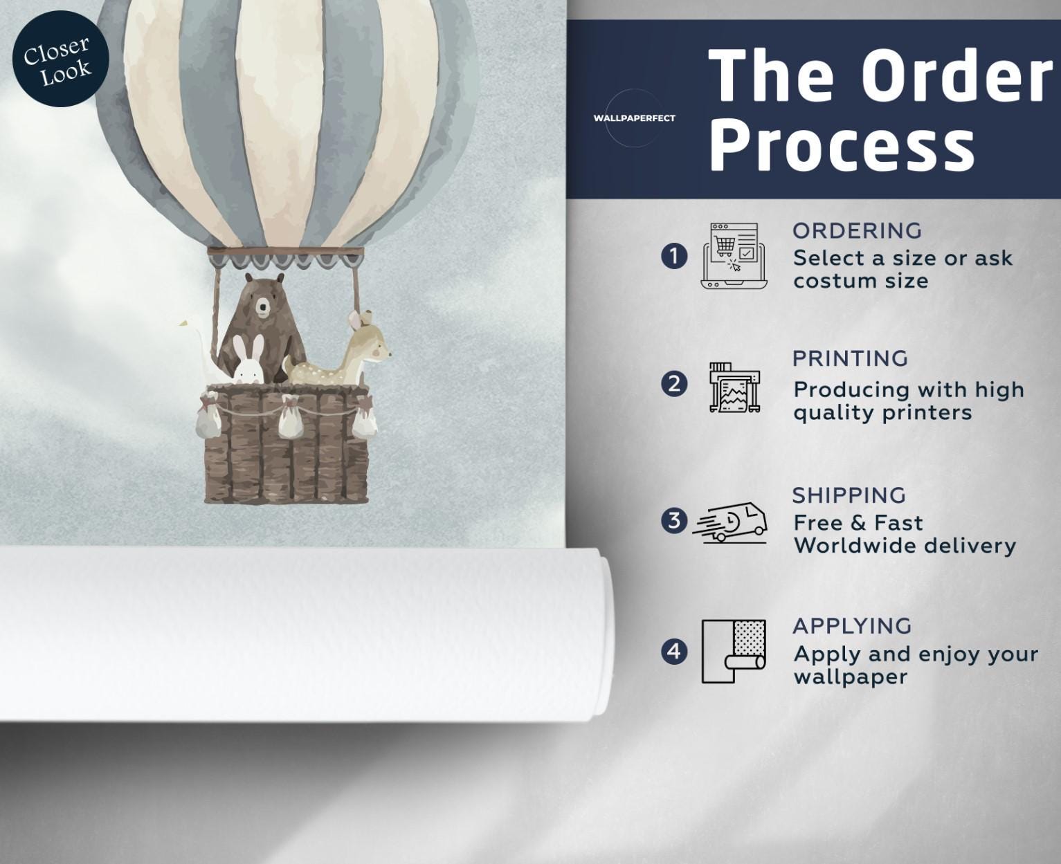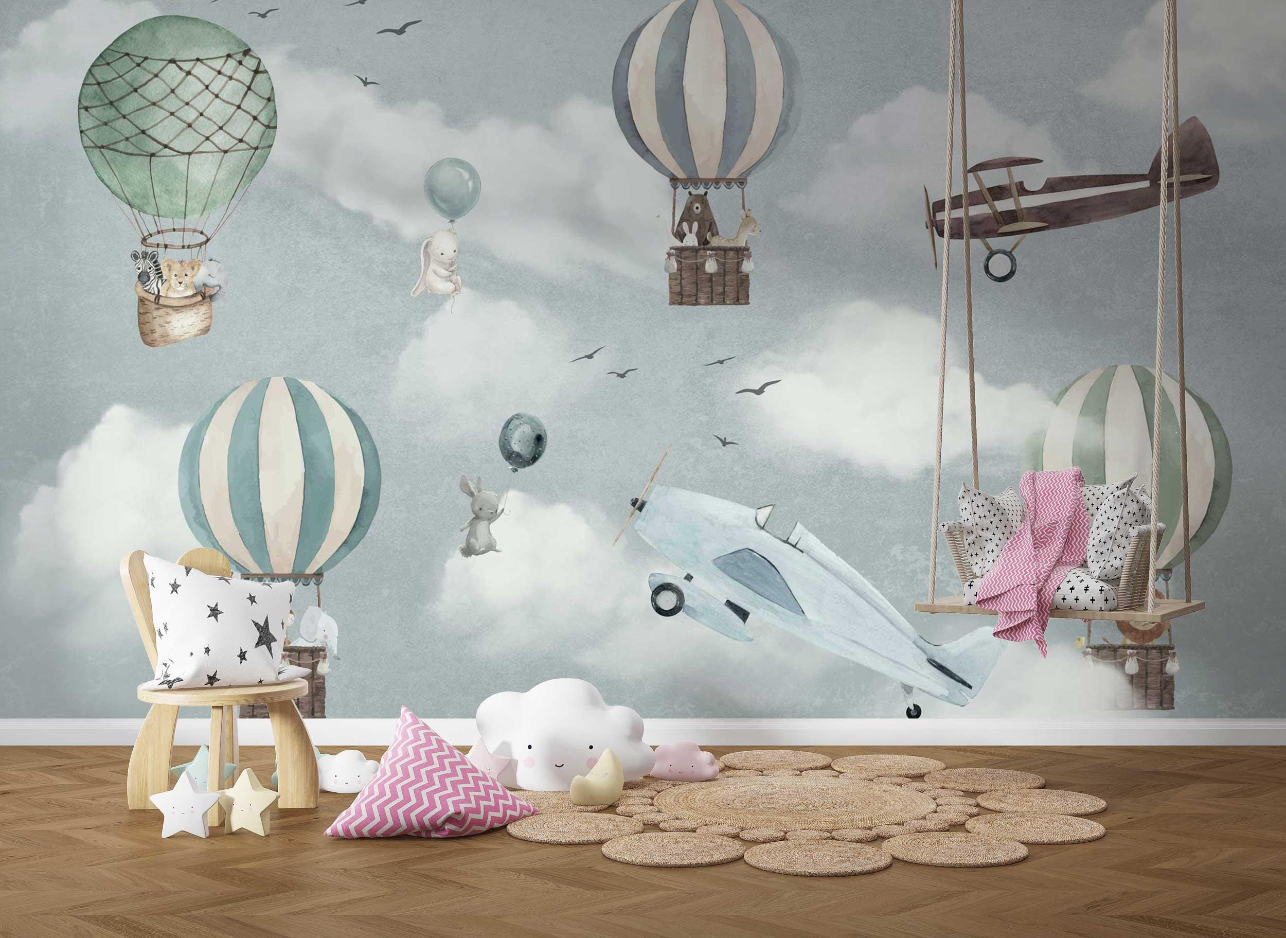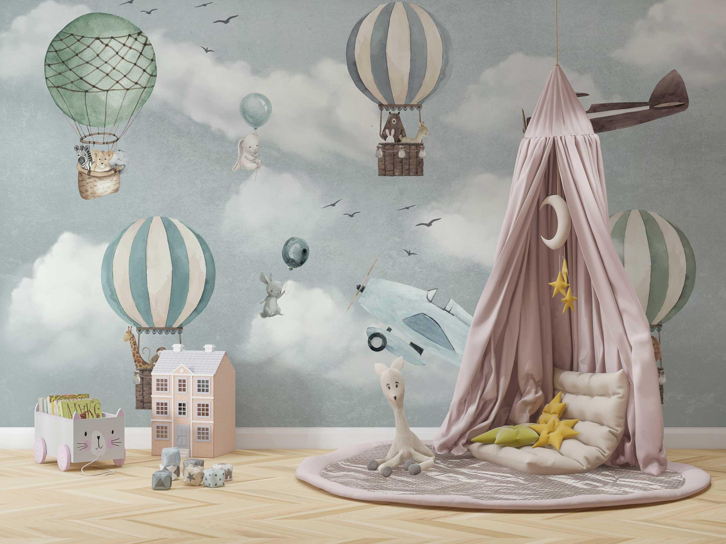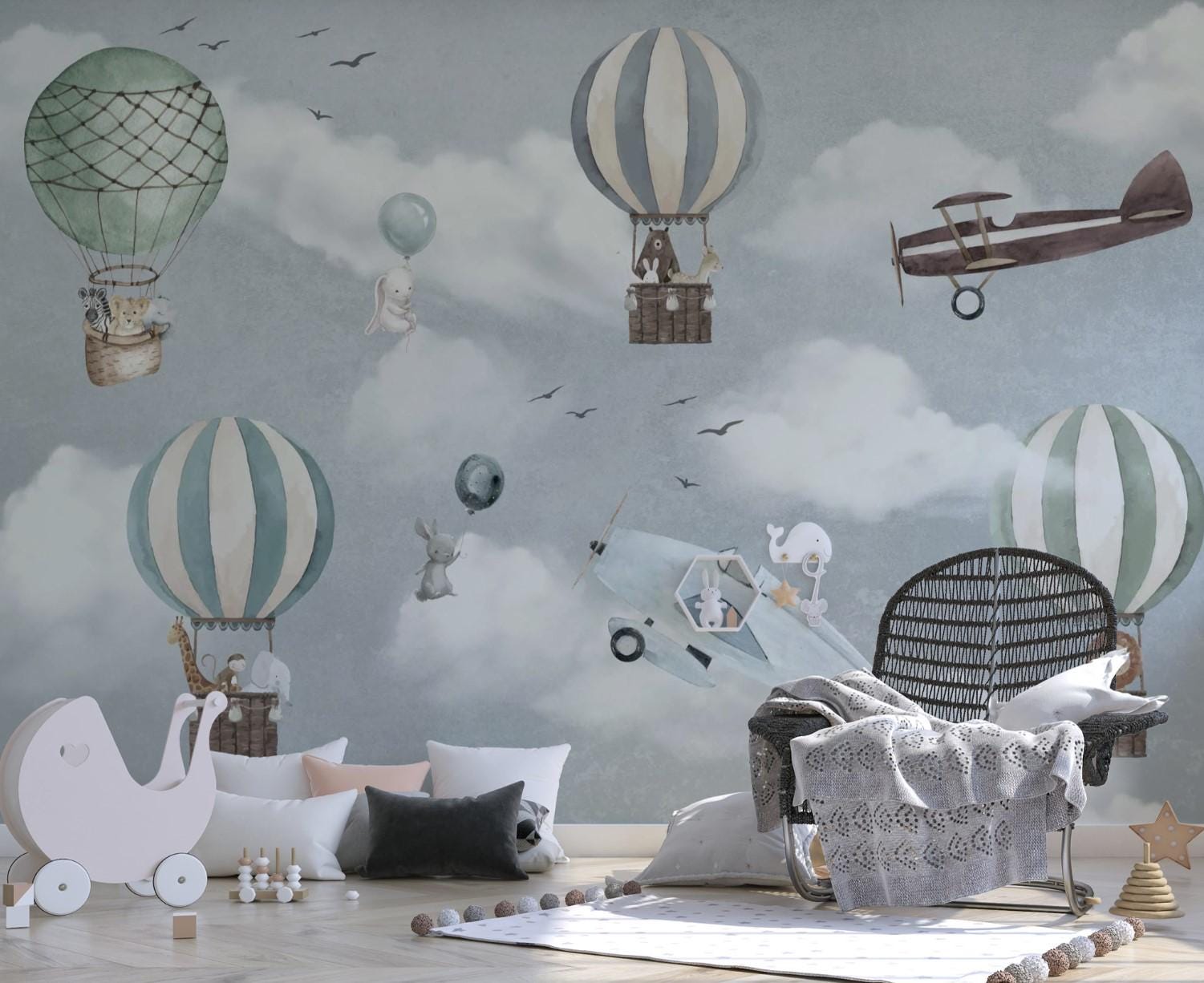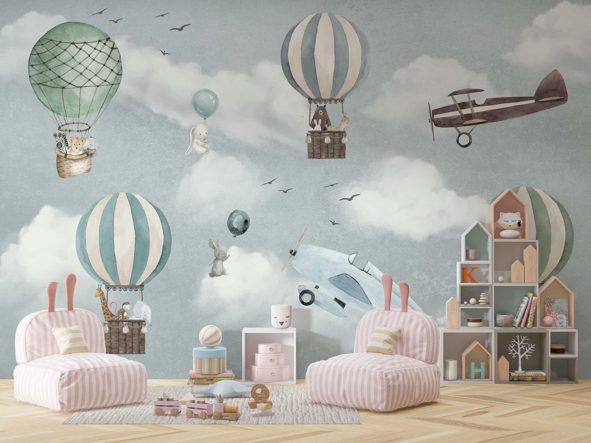 Turn your nursery into a dreamy sky adventure with this hot air balloon kids wallpaper. Featuring playful animals in balloons, airplanes flying through soft clouds, and pastel tones, this mural creates a calm and magical atmosphere for your baby’s room.