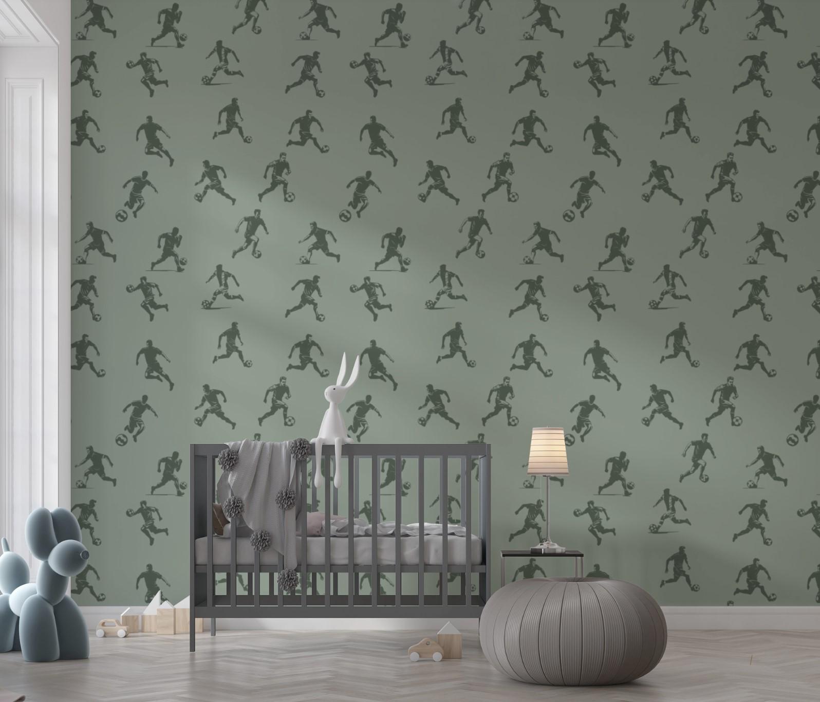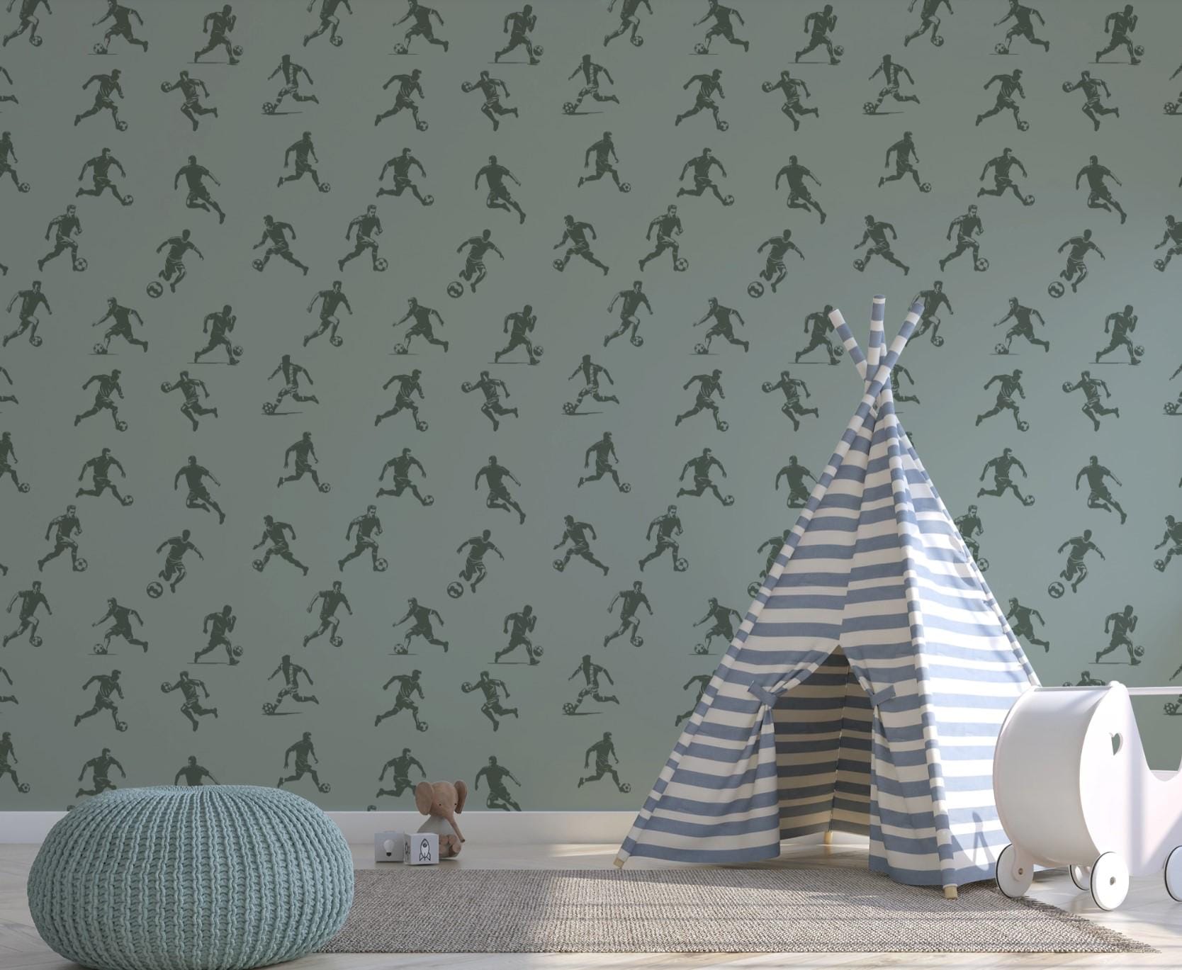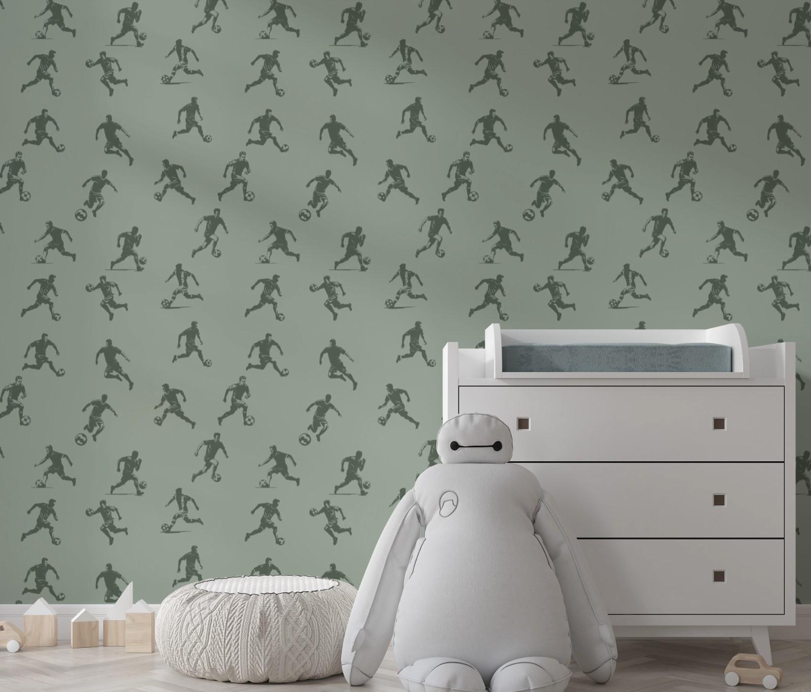 Soccer Player Silhouette Wallpaper – Sports Theme Wall Mural for Boys Room or Nursery, Minimalist Green Football Wallpaper