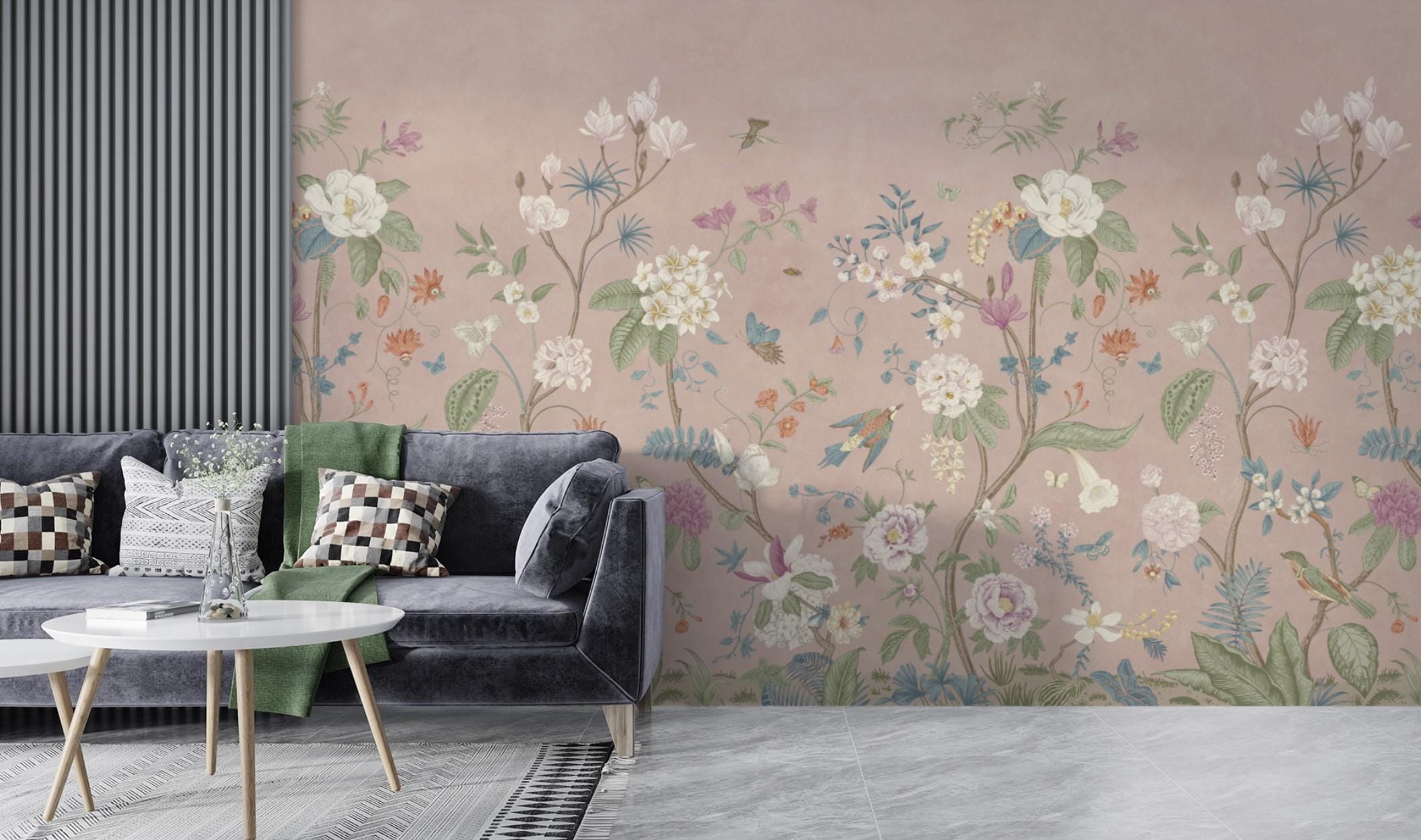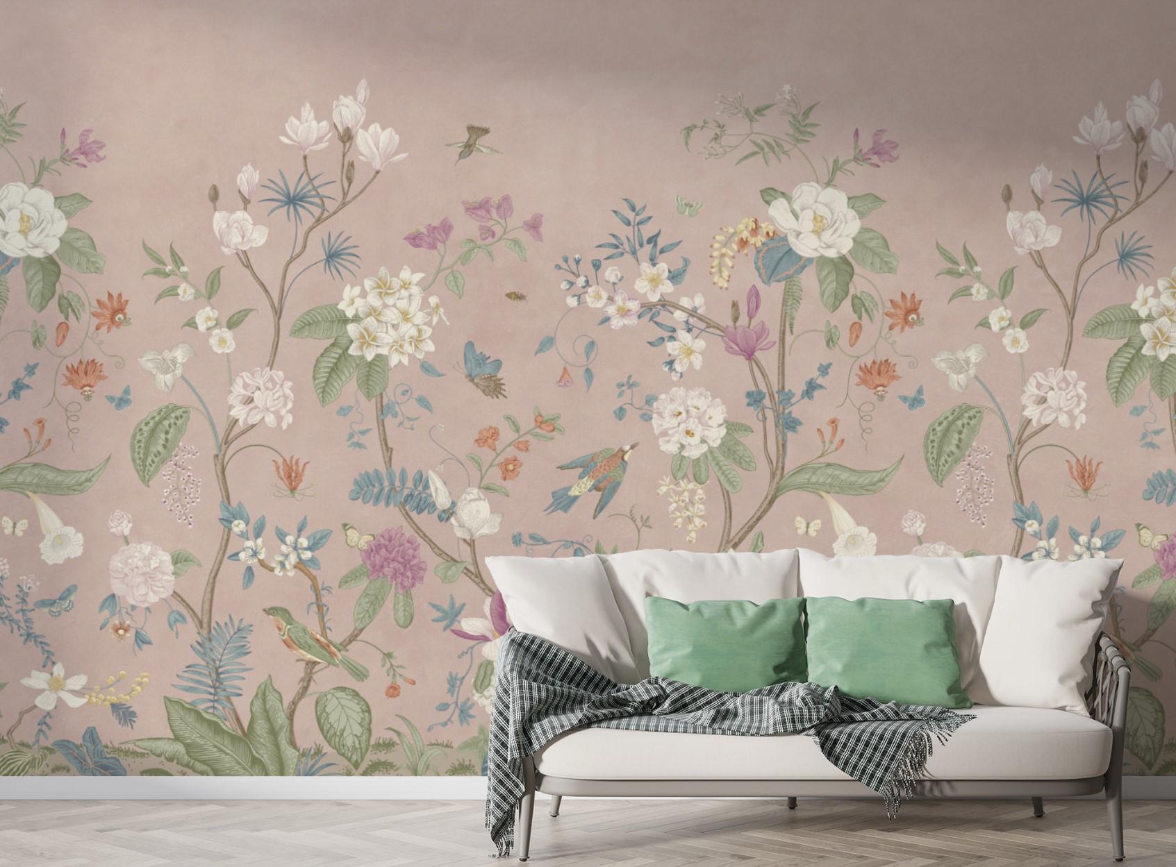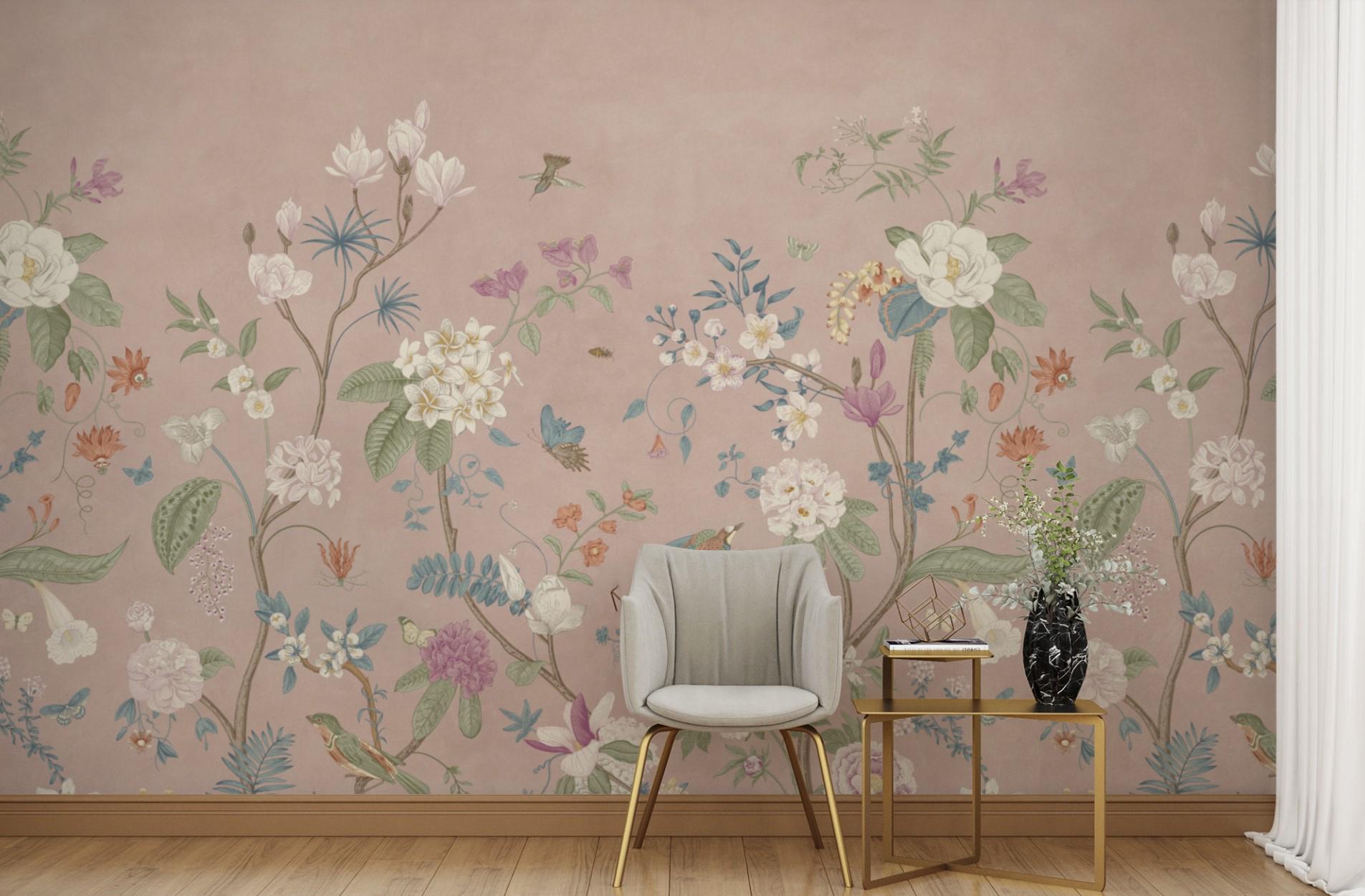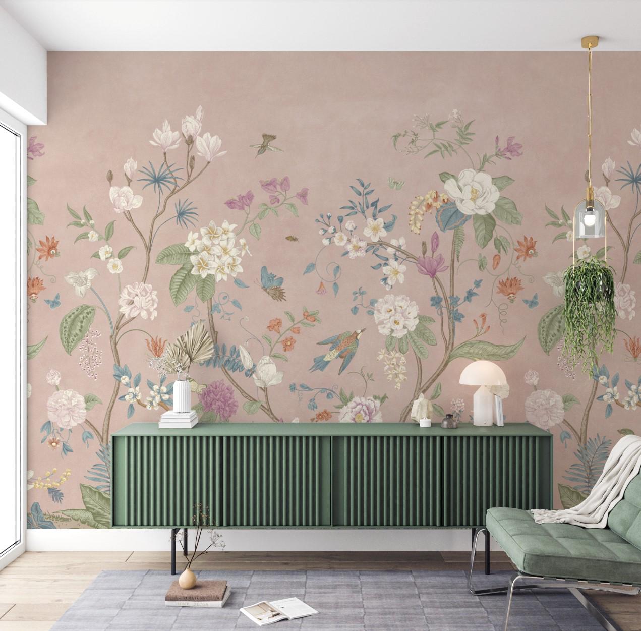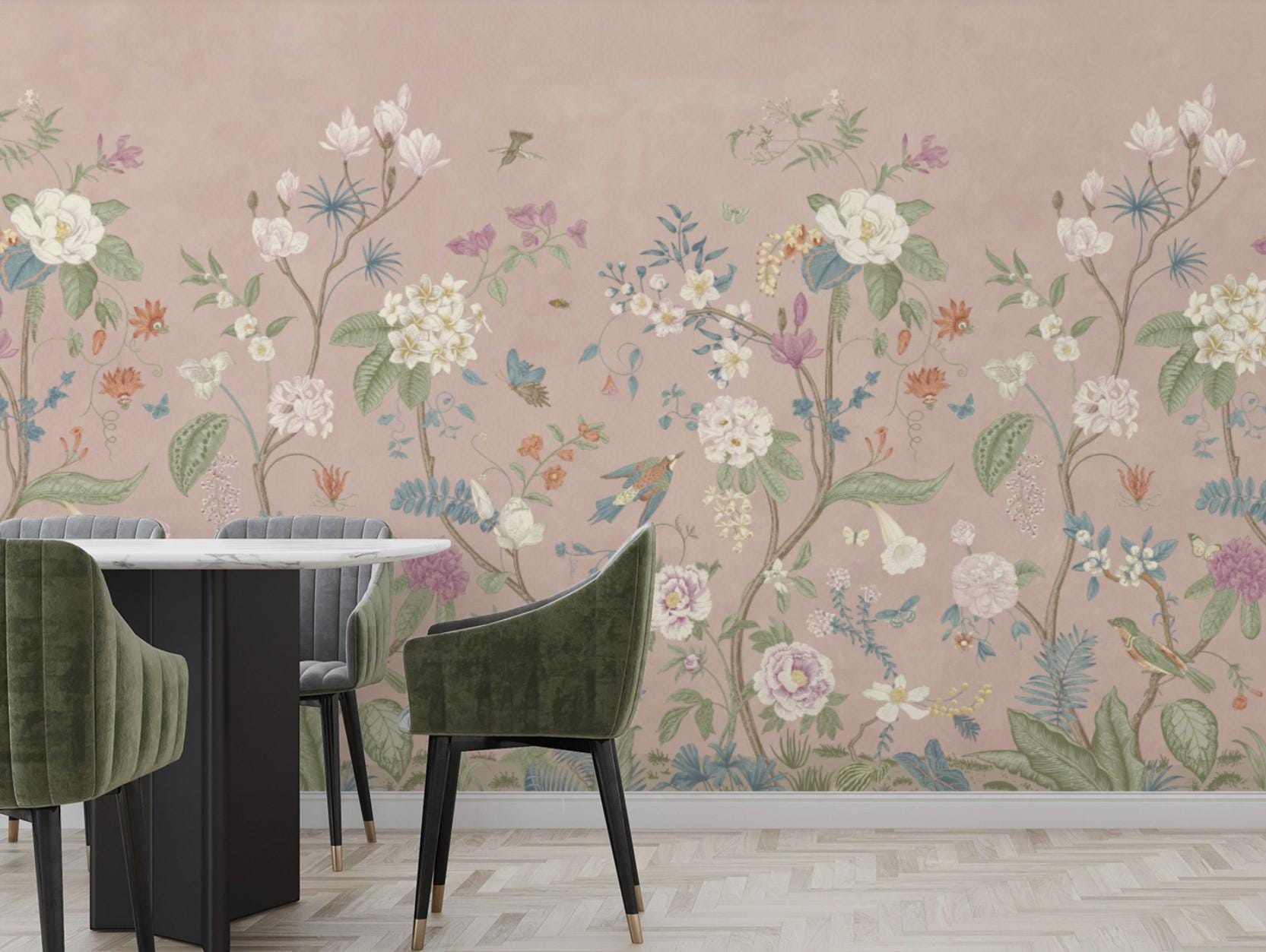 Elegant Asian Style Floral Wallpaper Mural, Vintage Botanical with Birds Wall, Pink Garden Design, Living Room Decor, Traditional Wallpaper