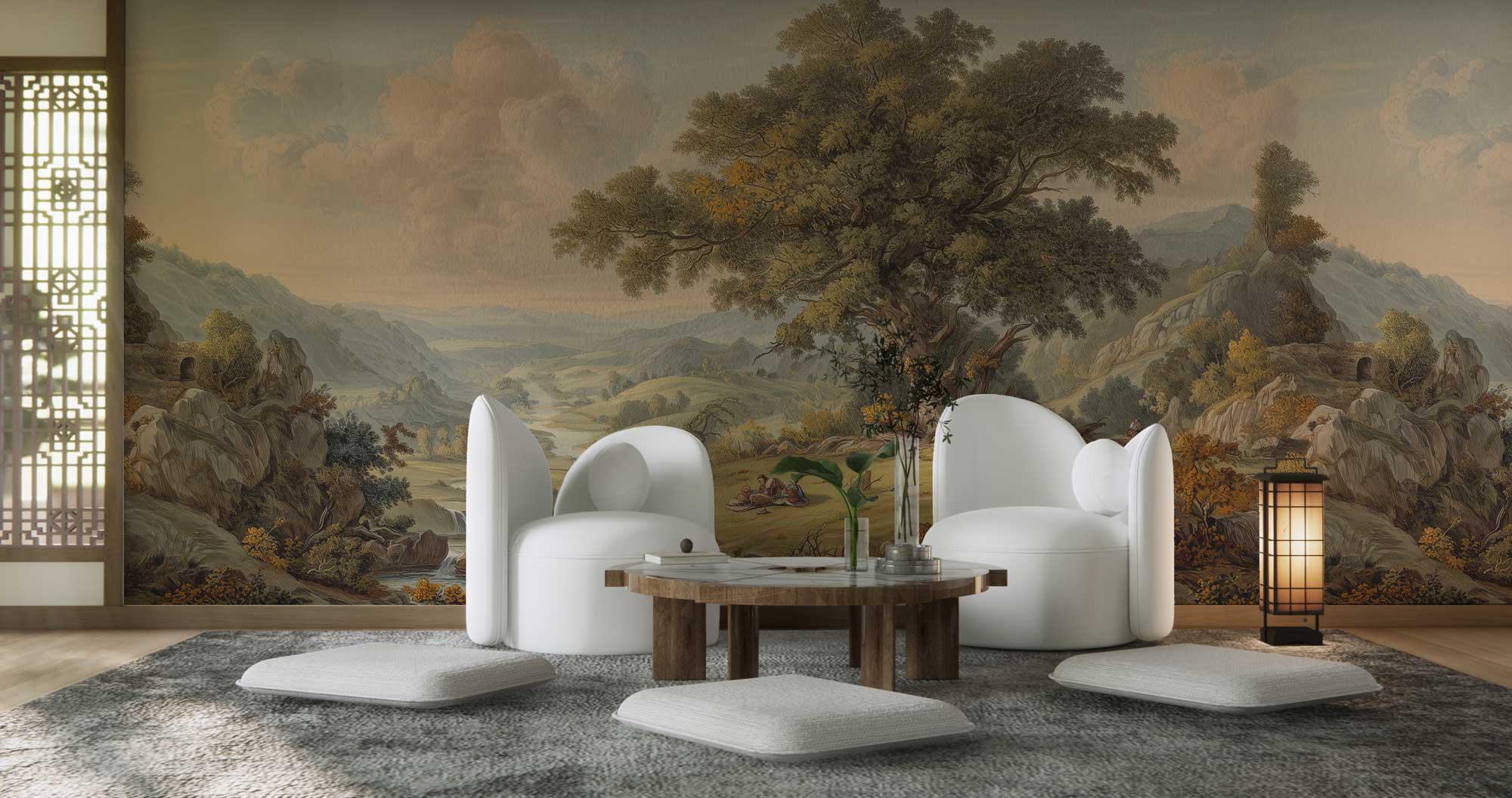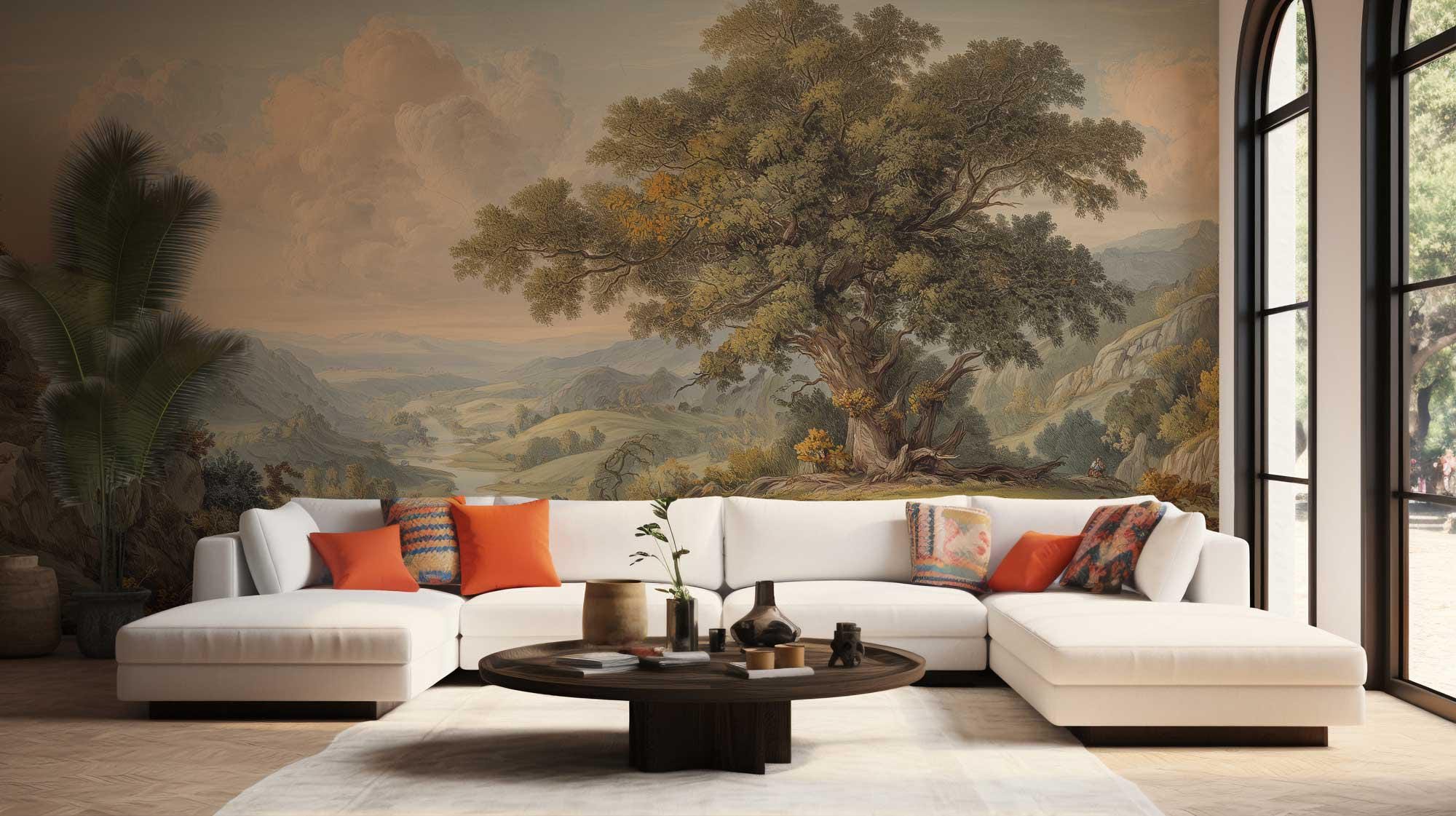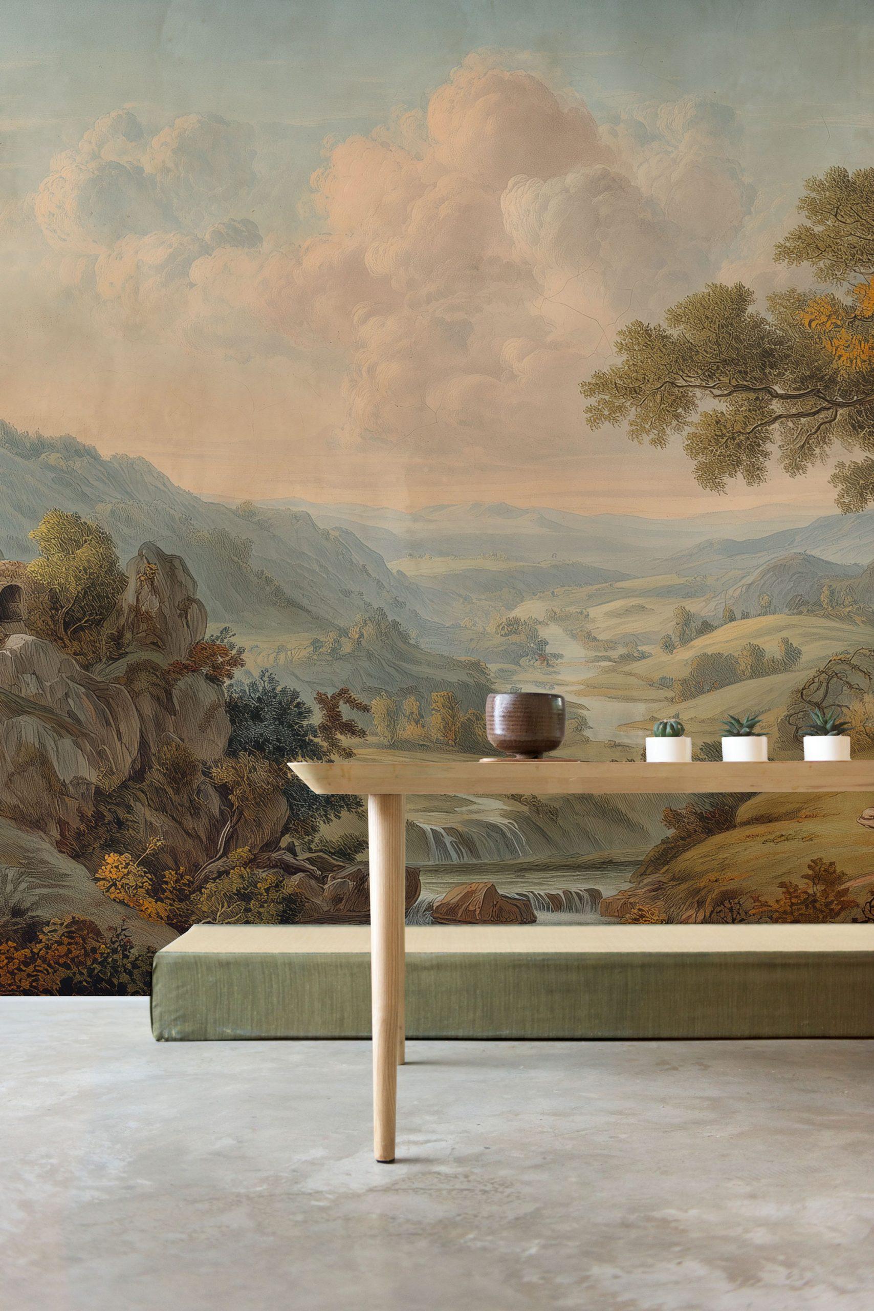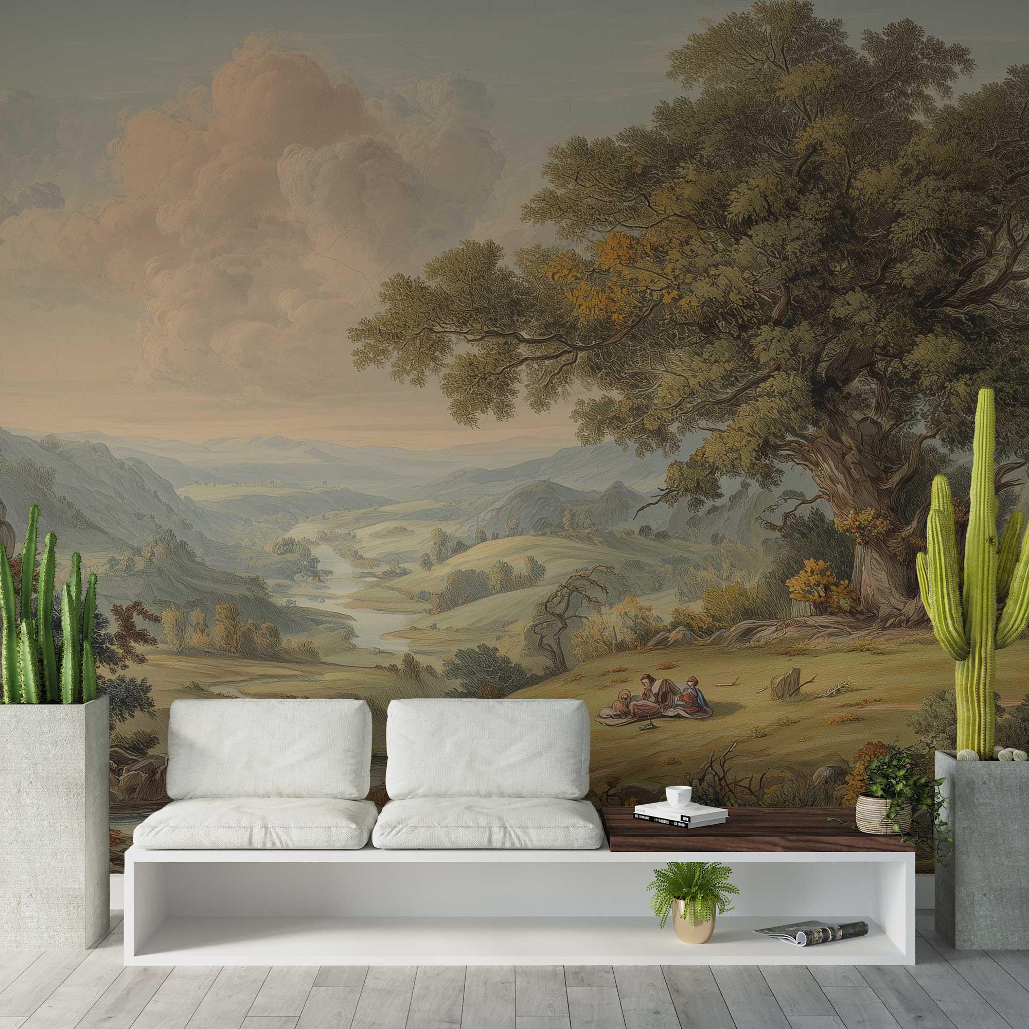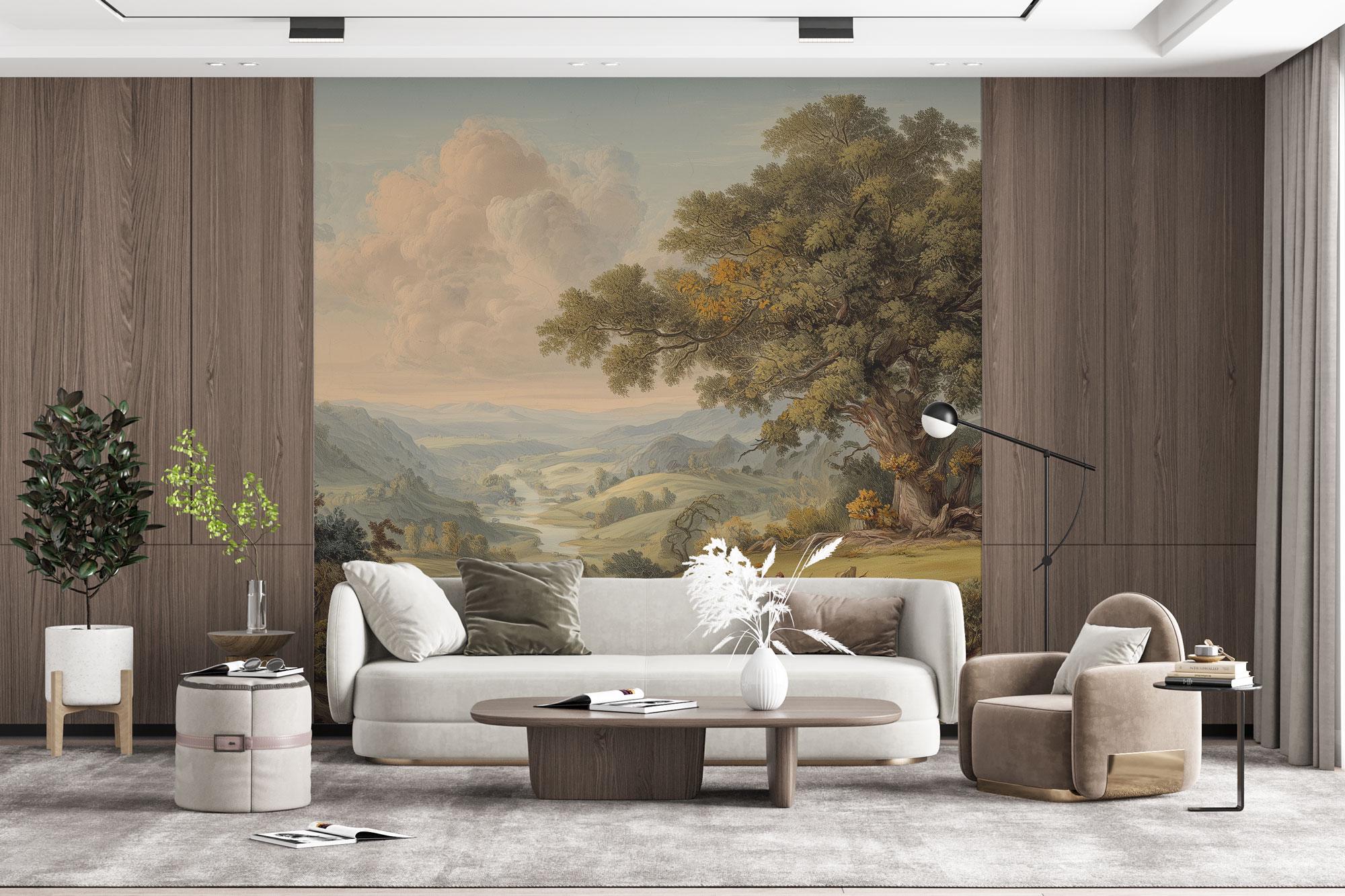 Vintage Landscape Wall Mural – Large Tree Mountain Scenery Wallpaper – Classic European Art Mural – Custom Size Peel & Stick / Non-Woven