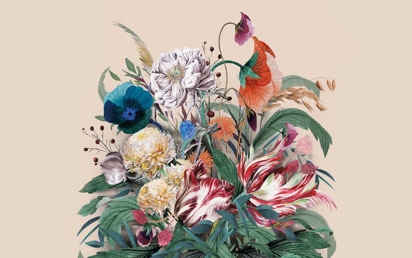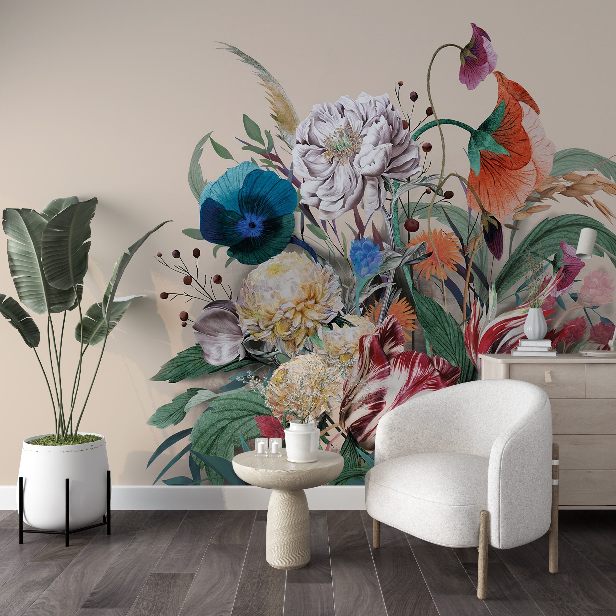 Large Colorful Floral Mural Wallpaper, Vibrant Botanical Wall Art with Modern Flowers Design for Living Room, Bedroom or Accent Wall Decor