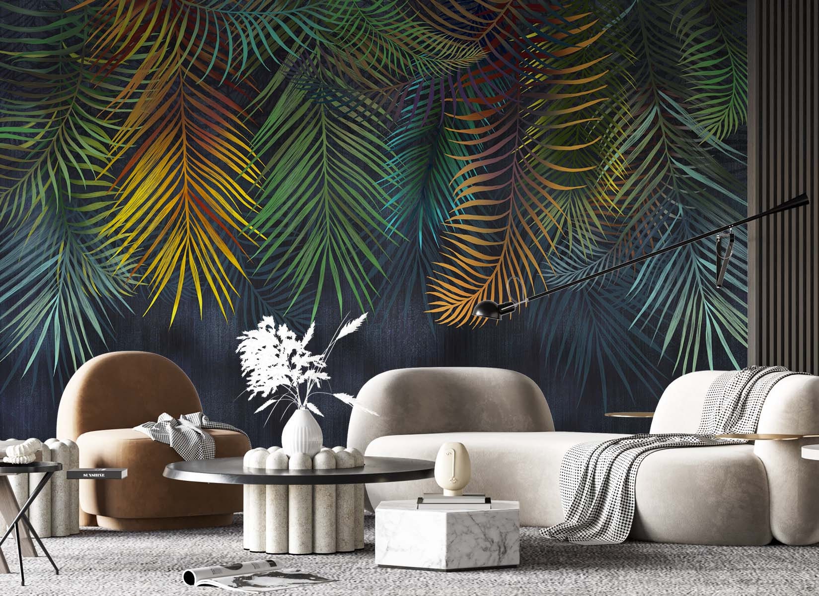 Tropical Palm Leaf Mural, Dark Tones Botanical Wall Art, Modern Bedroom Wall Decor, Colorful Jungle Leaves Design Peel and Stick Wall Panels