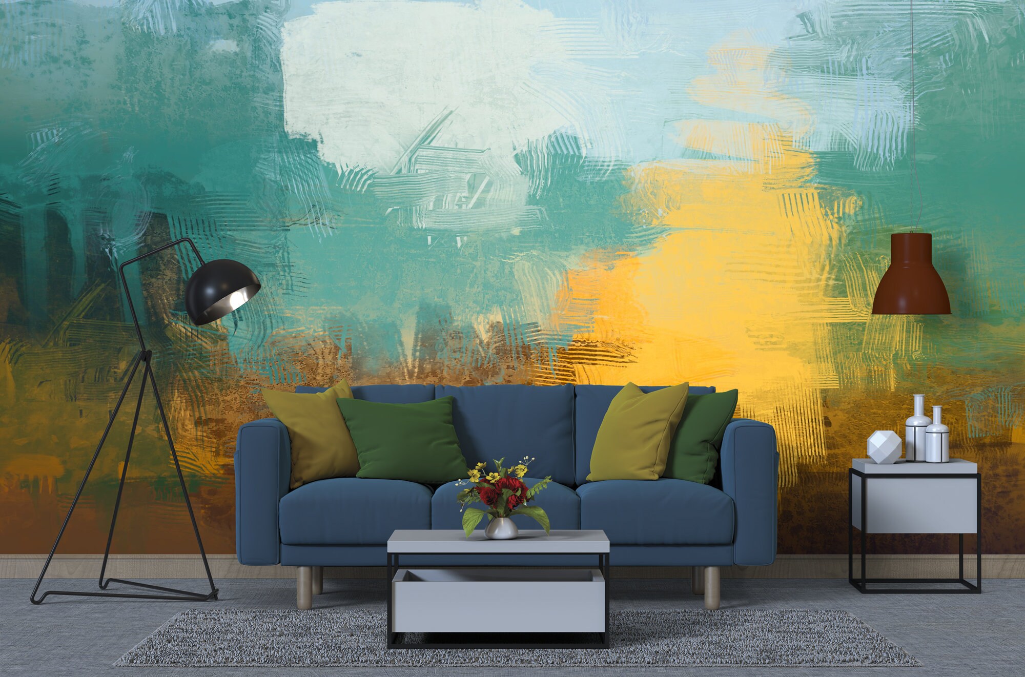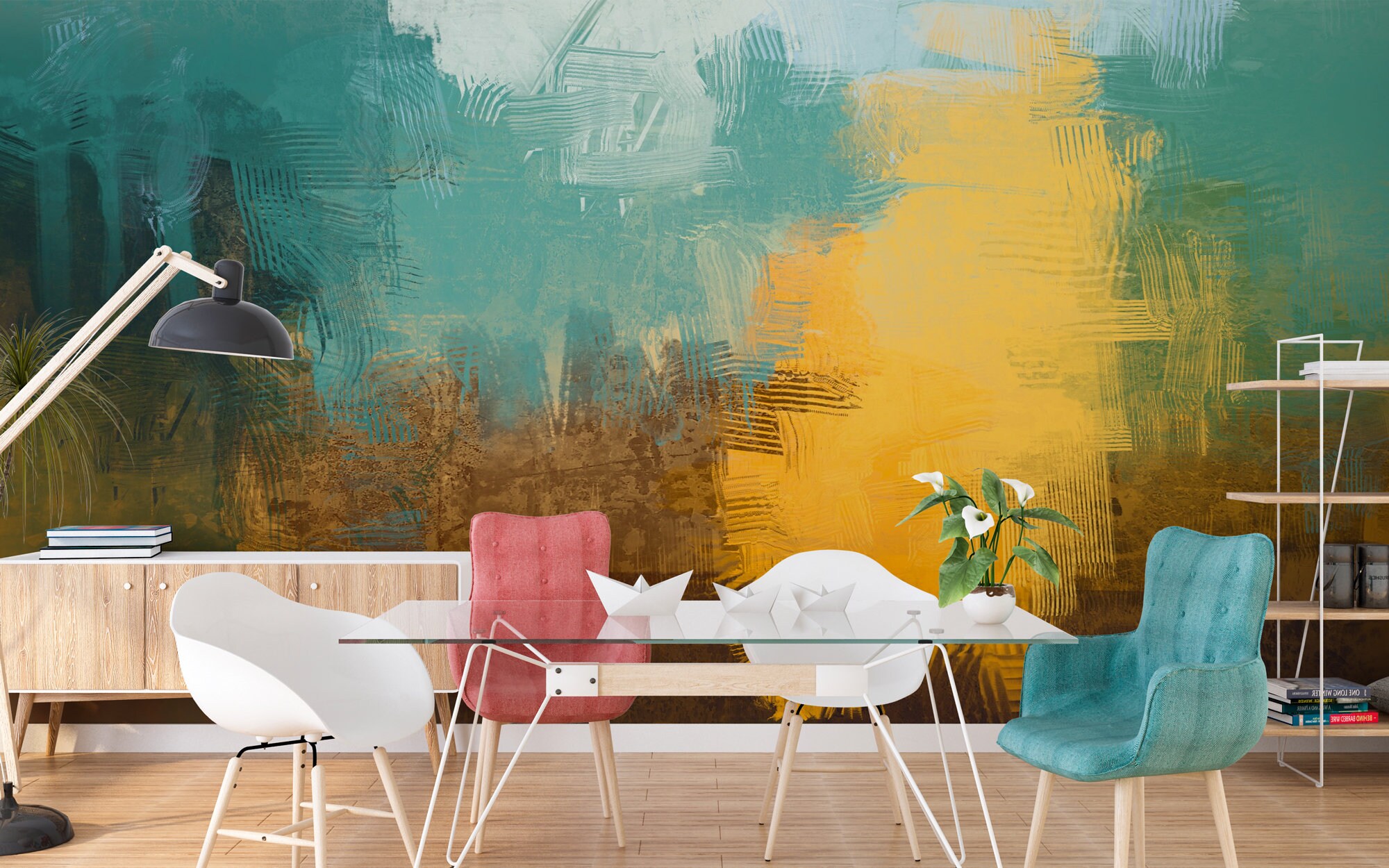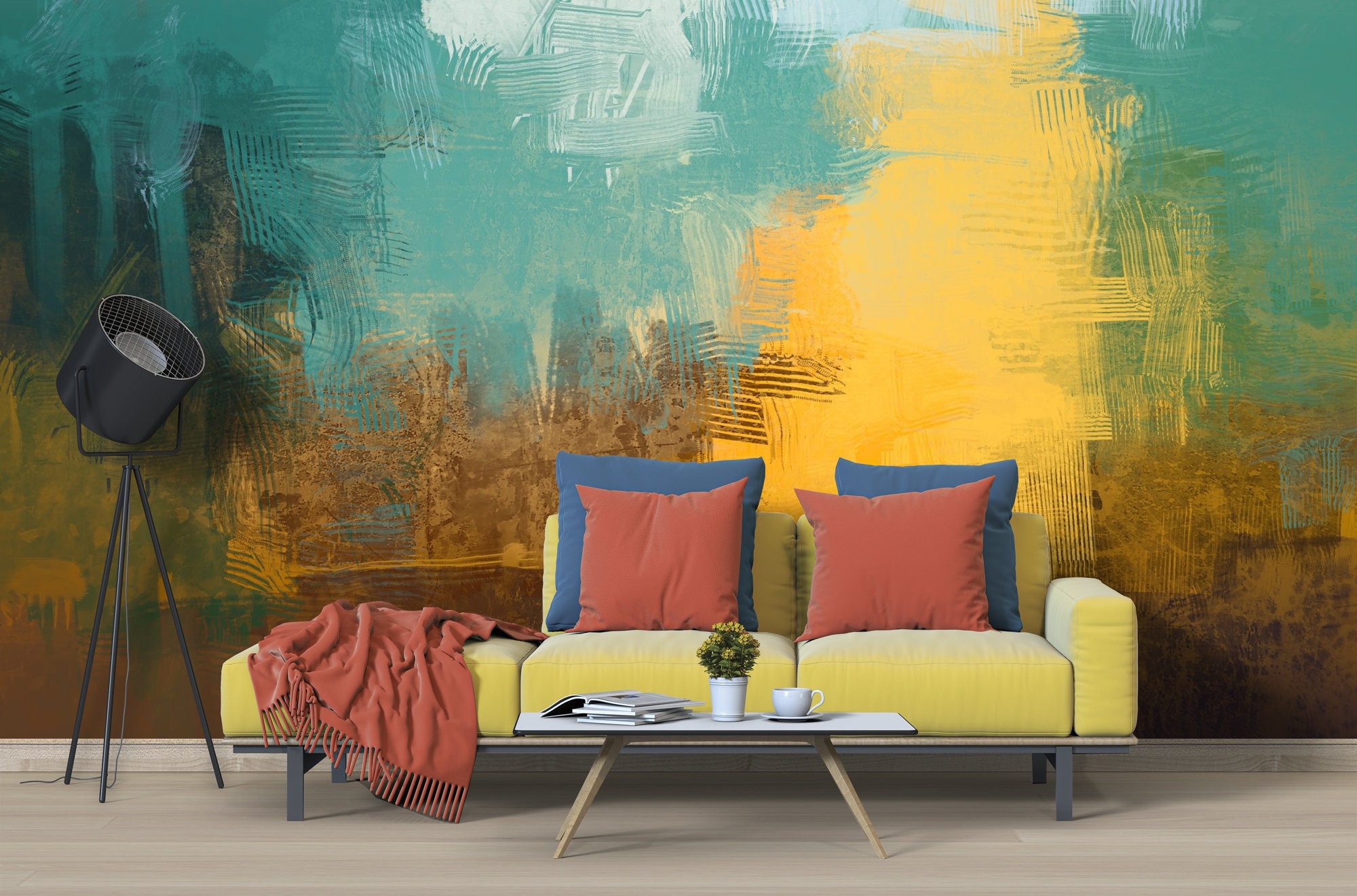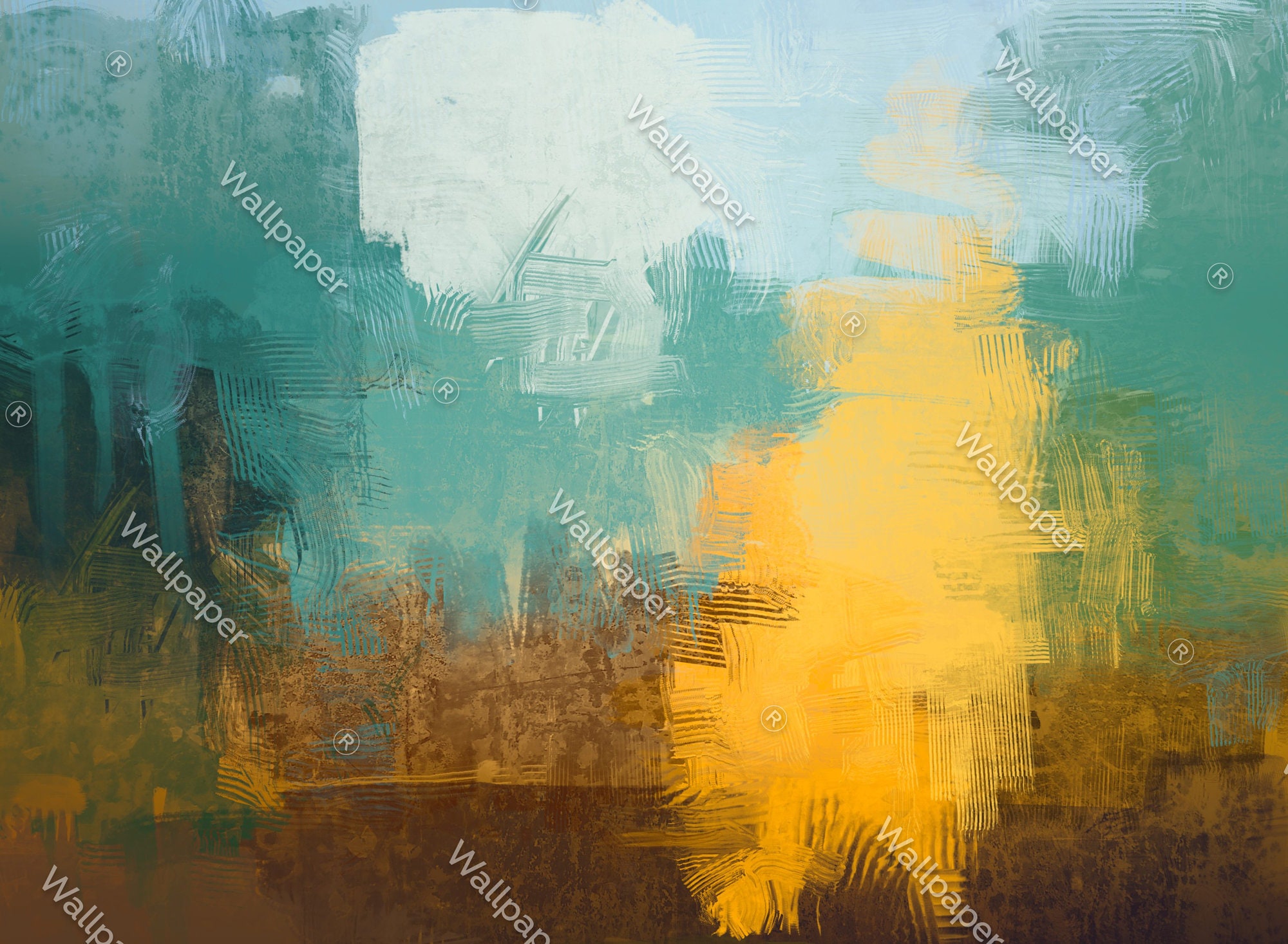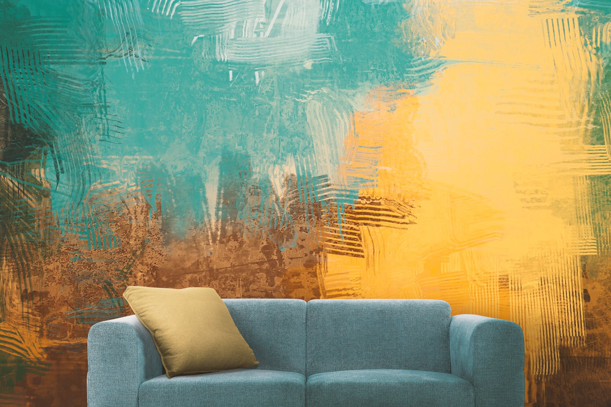 Abstract Teal and Gold Wall Mural, Oil Paint Brush Effect Peel and Stick Wall Panels, Pastel Color Paint Wall Look Living Room Decor