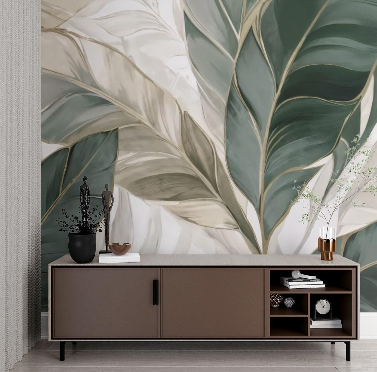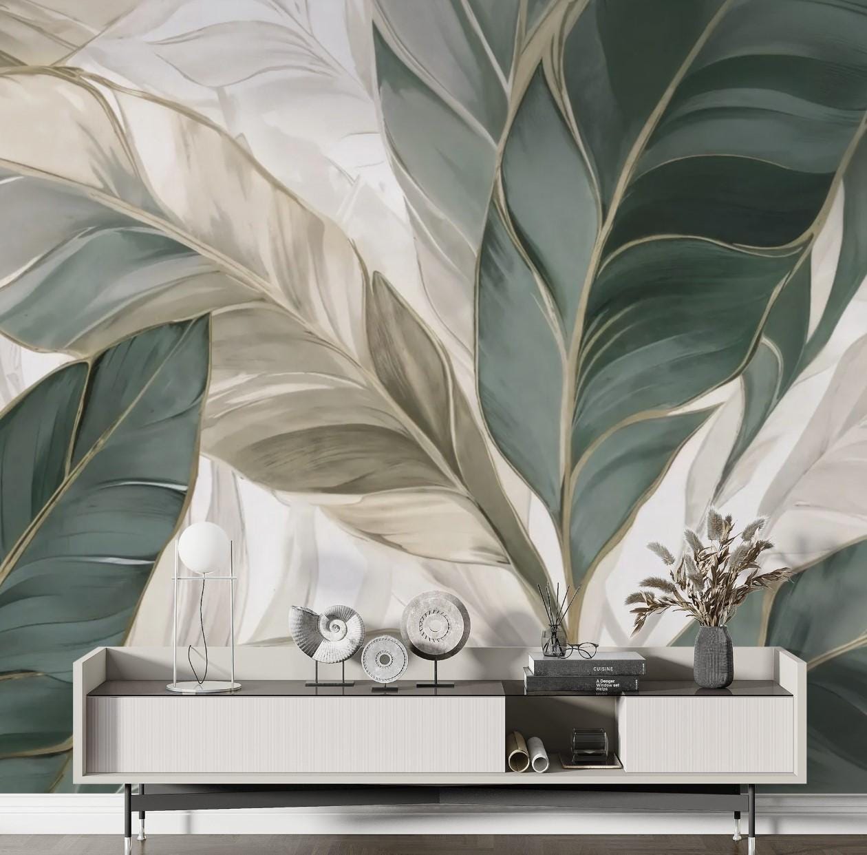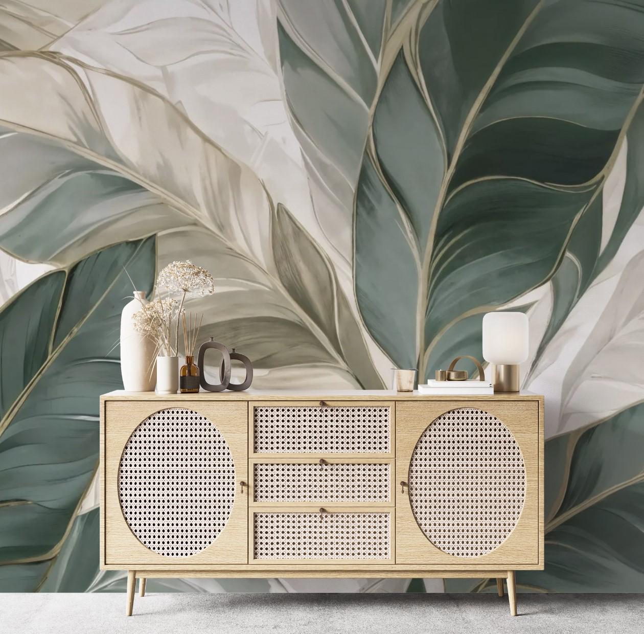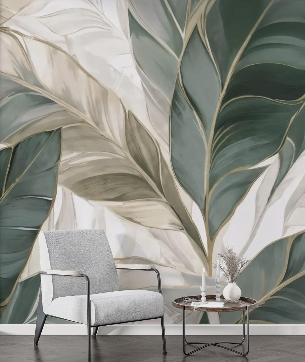 Modern Botanical Leaf Pattern Wallpaper, Abstract Green Beige Wall Mural, Elegant Nature Green Art Decor for Inspired Living Room or Bedroom
