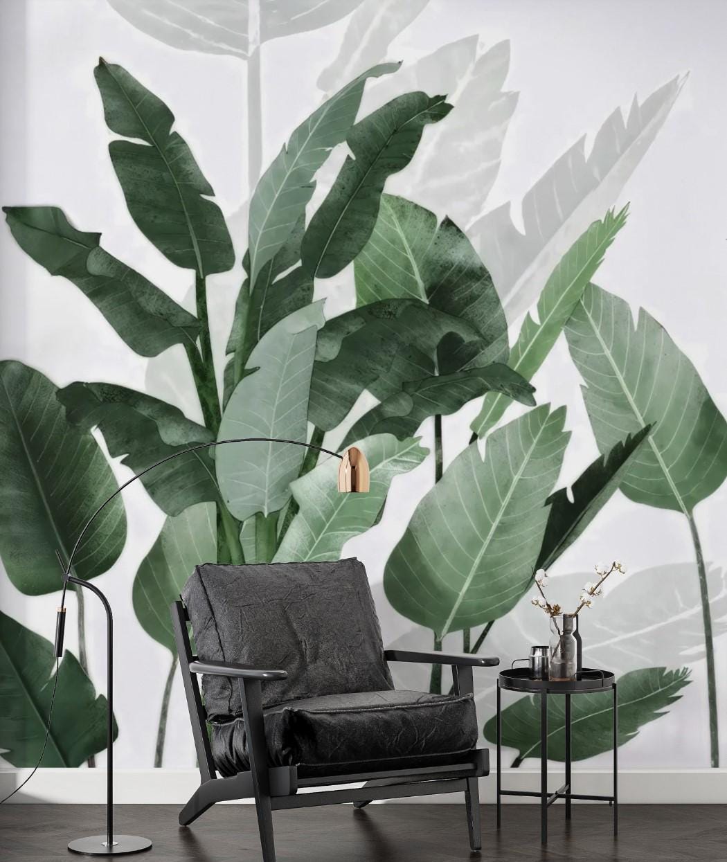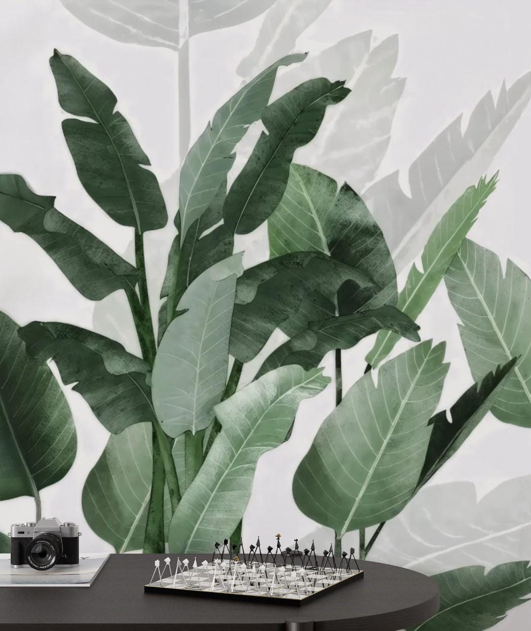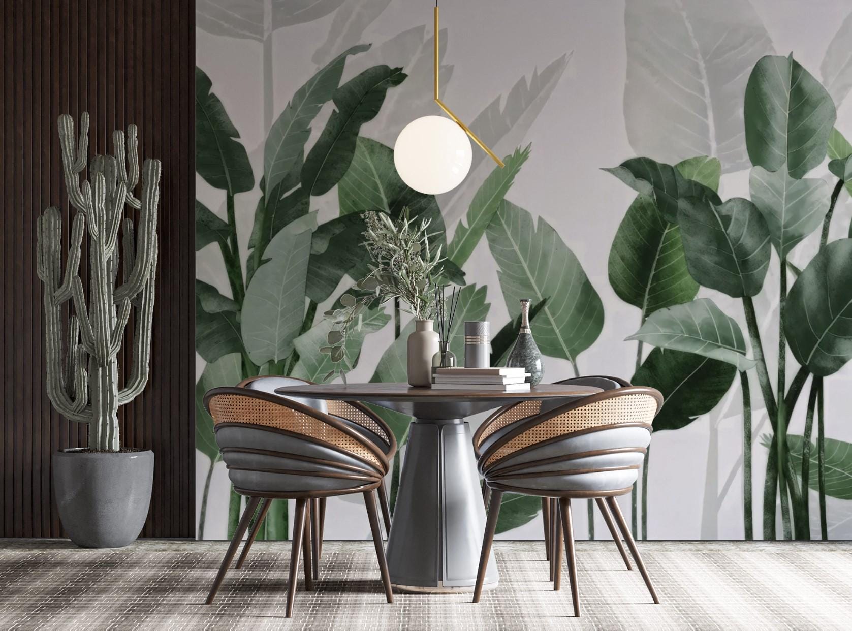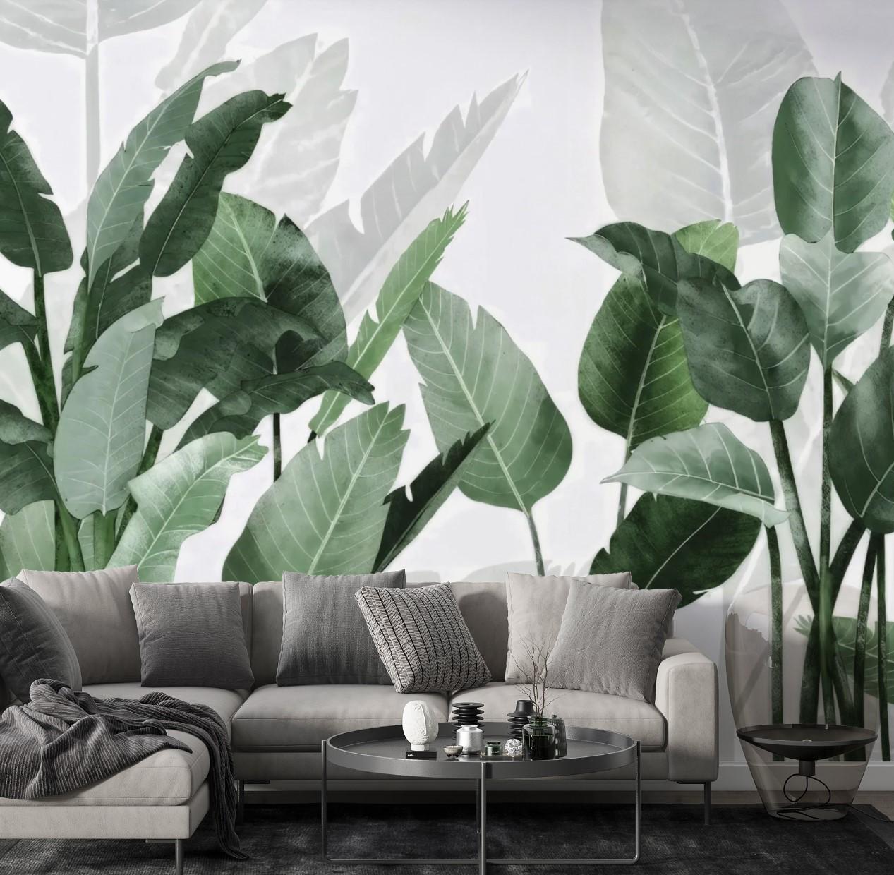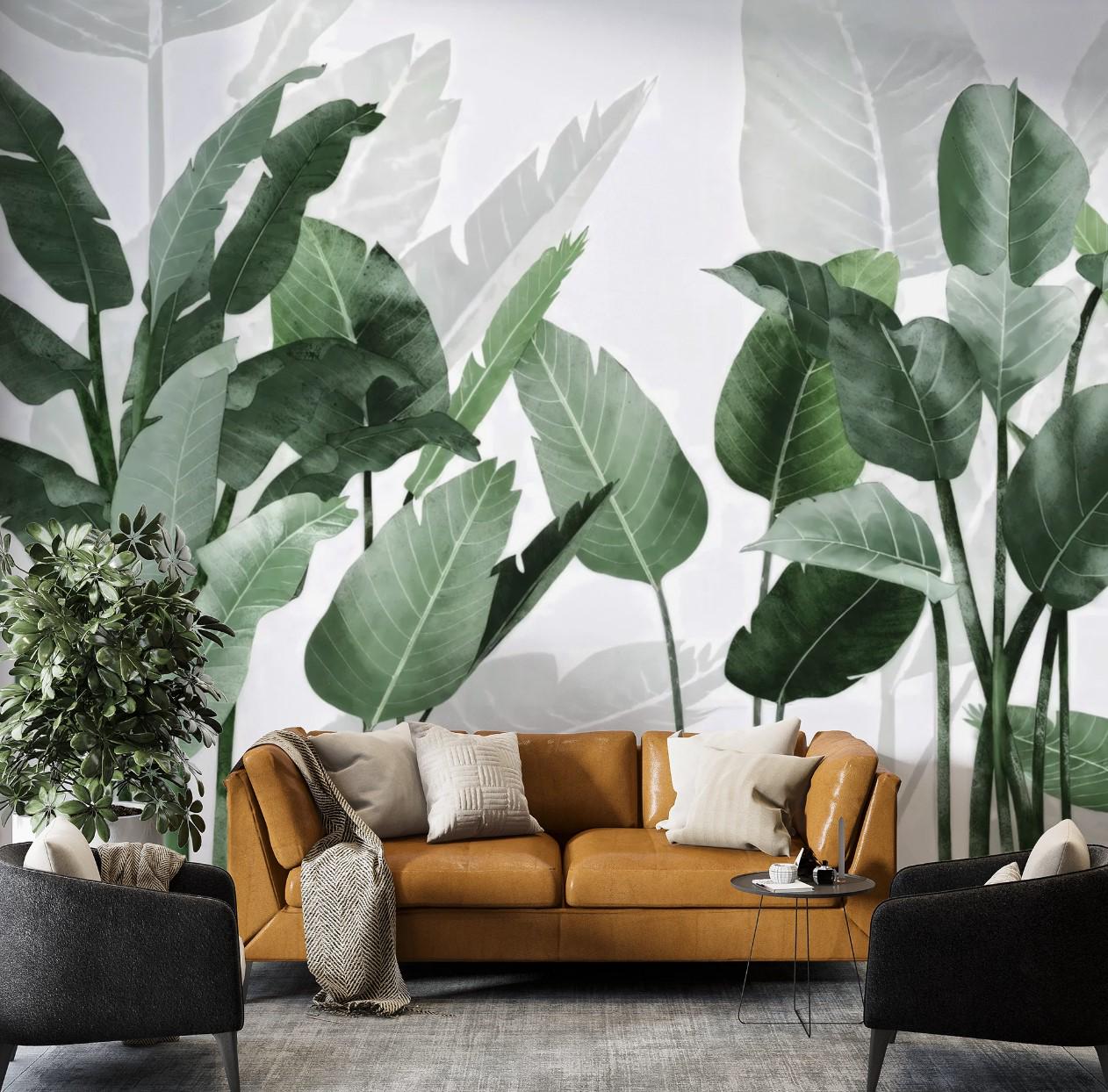 Tropical Green Leaf Wallpaper, Modern Botanical Peel and Stick Wall Panels, Minimalist Jungle Leaves Wall Art, Living Room Nature Wall Decor
